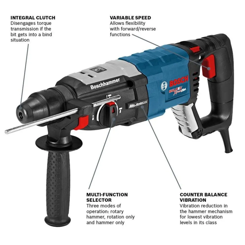 The Bosch GBH2-28L 1-1/8 in. SDS-plus Bulldog Xtreme Max Rotary Hammer features outstanding power and speed to get the job done. It is a hammer that merits its place in the line of legendary Bulldogs. It weighs only 6.9 lbs., but it features an 8.5-amp motor that provides outstanding performance. It delivers 2.4 ft-lbs. of impact energy and 0-5,100 impacts per minute. It includes advanced Bosch technology that provides operator control and comfort – KickBack Control and Vibration Control. The user can optimize the chiseling angle with Vario-Lock positioning. Concrete contractors, framers and other construction pros can use this hammer to get more work done more easily. The GBH2-28L has three modes for maximum versatility – drilling only, hammer drilling and chiseling.