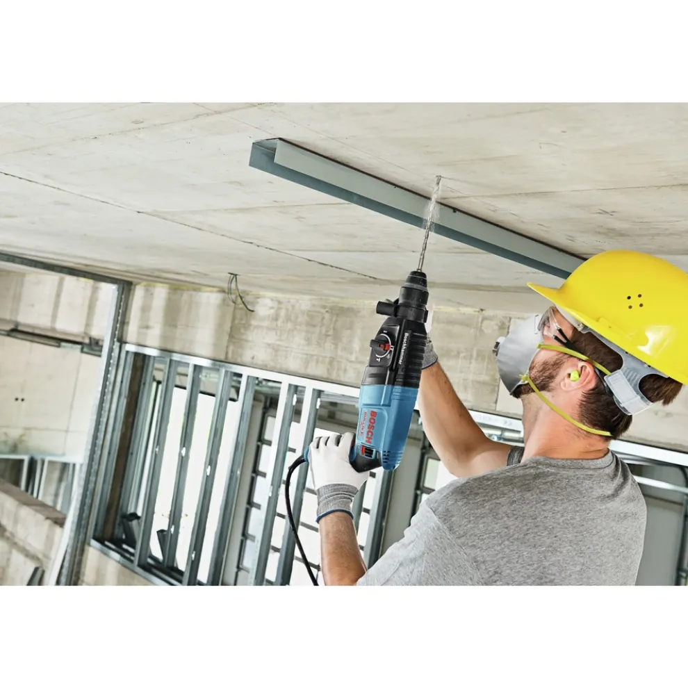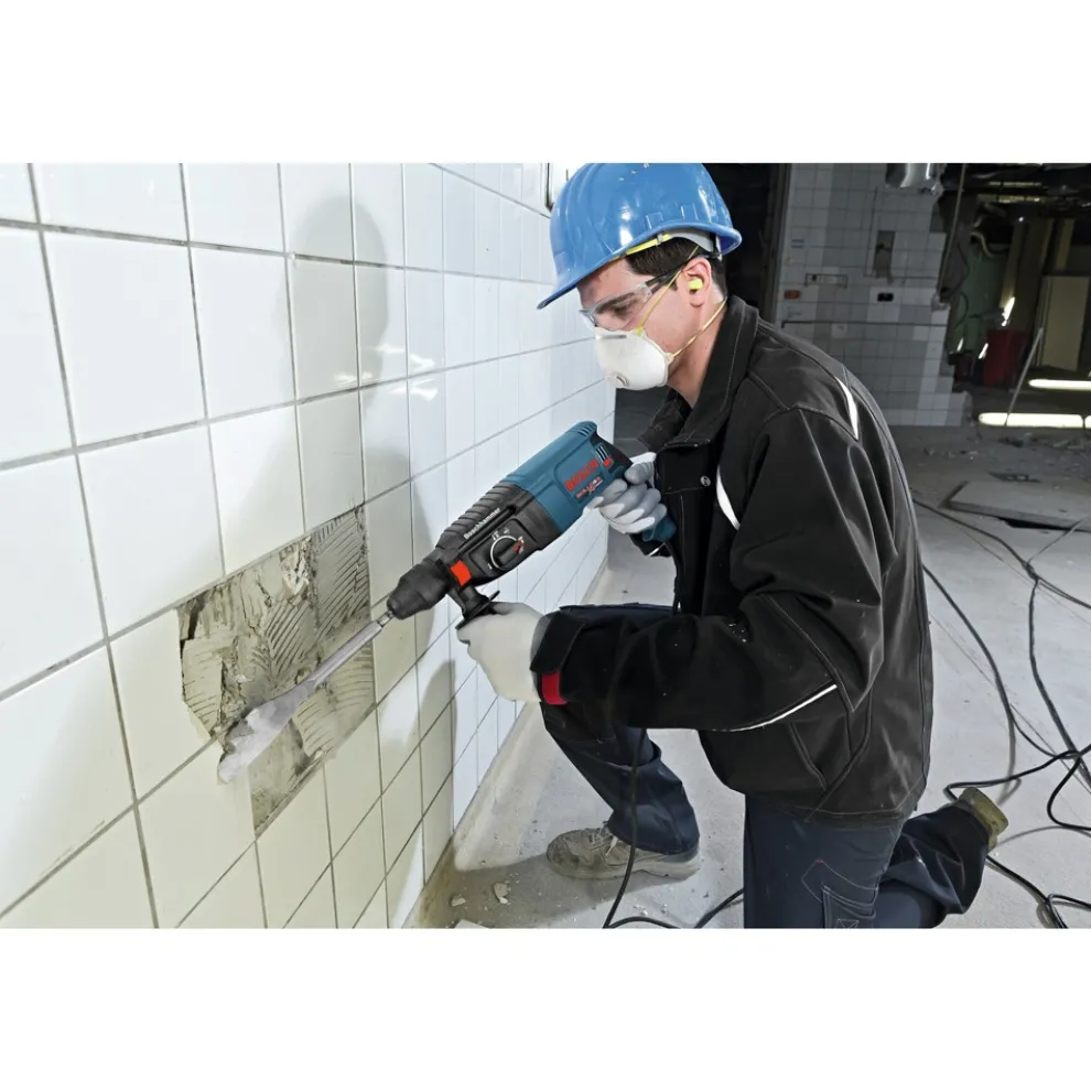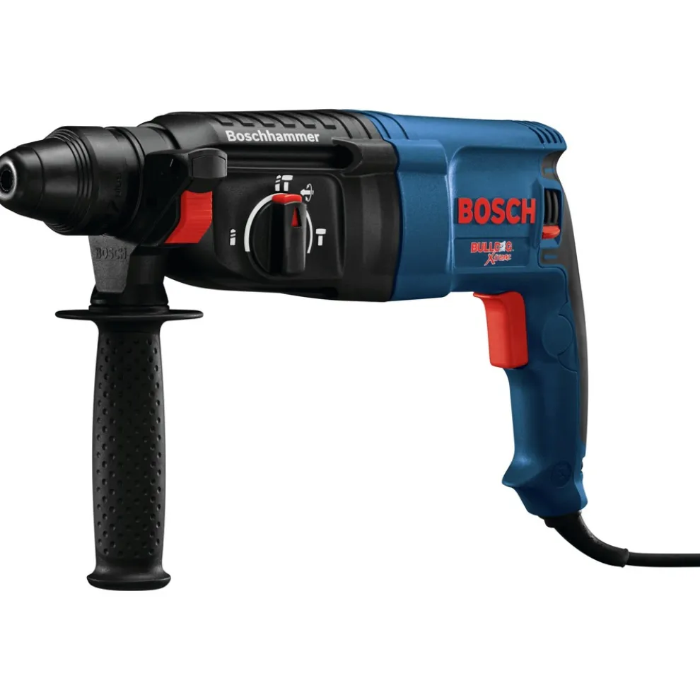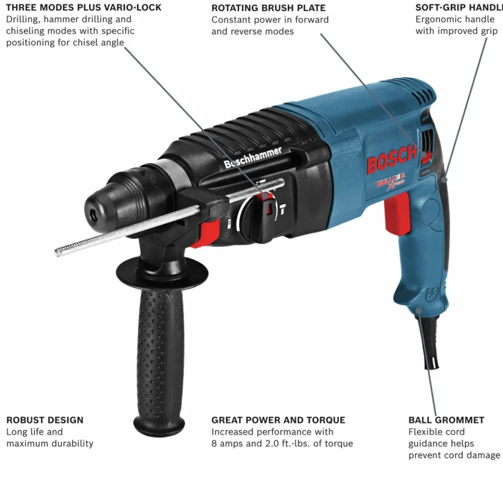 The Bosch GBH2-26 1 in. SDS-plus Bulldog Xtreme Rotary Hammer provides outstanding power and speed to get the job done, day after day. One in a line of legendary Bulldogs, this hammer weighs only 6.4 lbs., but it features an upgraded 8.0-amp motor that provides outstanding performance, delivering 2.0 ft-lbs. of impact energy and 0-4,000 impacts per minute. The GBH2-26 has three modes for maximum versatility – drilling only, hammer drilling and chiseling. The user can optimize the chiseling angle with Vario-Lock positioning. The hammer also provides a variable-speed reversing trigger for accurate bit starting and removing. A pistol-type handle with a soft-grip design helps to provide first-class user comfort.