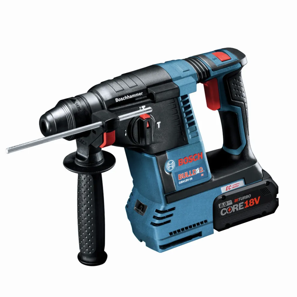 This Bosch 18V Bulldog Hammer consistently outperforms the best-selling 1 in. corded 11255VSR Bulldog, making it better than the best. The Bosch GBH18V-26K24A-RT kit pairs (2) CORE18V 8 Ah Performance Lithium-Ion Batteries with an SDS-plus Bulldog 1 in. Rotary Hammer that delivers 1.9 ft-lbs. of impact energy (EPTA). The hammer’s Brushless motor maximizes battery runtime for extended performance. It also has KickBack Control, an integrated sensor to stop tool rotation in bind-up situations; Electronic Precision Control, for smoother bit starts; and Vibration Control, for extended user comfort. It weighs only 8.4 lbs. (with included battery). The kit features (2) CORE18V Performance Batteries, which deliver 100% more runtime and over 75% more power than the 2-Layer 4 Ah batteries with minimal increase in volume and weight. They are engineered with 21700 cell technology and the exclusive CoolPack 2.0 technology to manage the heat of the higher power-density cells.