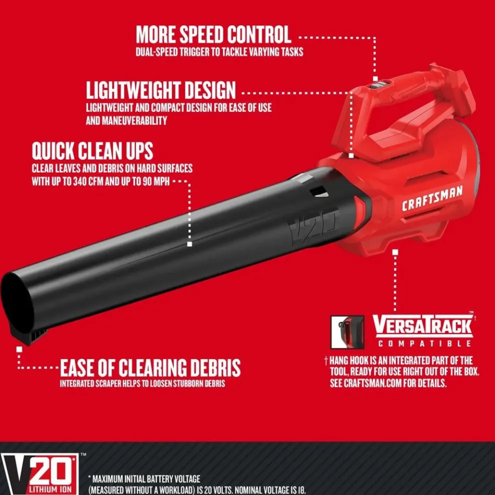 The V20 Cordless Axial Leaf Blower features a powerful motor that provides up to 340 CFM and 90 MPH. The V20 Cordless Axial Leaf Blower is compatible with the V20 range of batteries and chargers (sold separately). You can purchase the full line of outdoor products available in the V20 system from tools only, such as this leaf blower, to the leaf blower kit which includes a battery and charger. You’ll find the complete line of V20 outdoor tools and equipment essentials to complete your outdoor projects and make you proud.