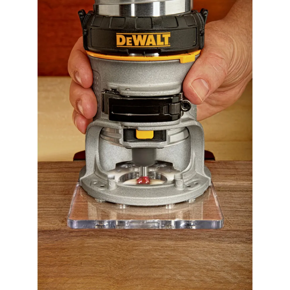 The DWP611 1-1/4 HP Max Torque Variable Speed Compact Router with LEDs has a 1-1/4 HP motor to deliver power for the toughest applications, and variable speed control for optimal bit speed in each application. Allows quick and easy bit and base changes. LED light and clear plastic fixed base provide superior bit visibility.