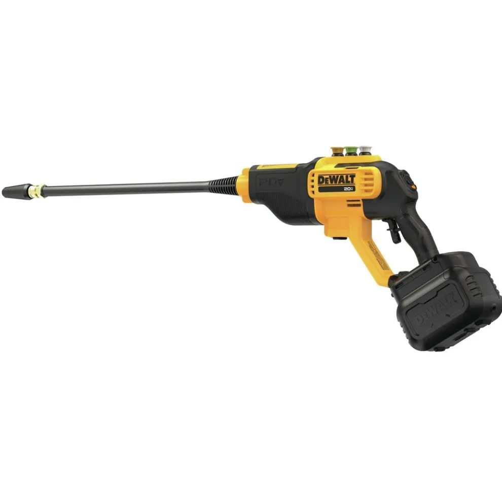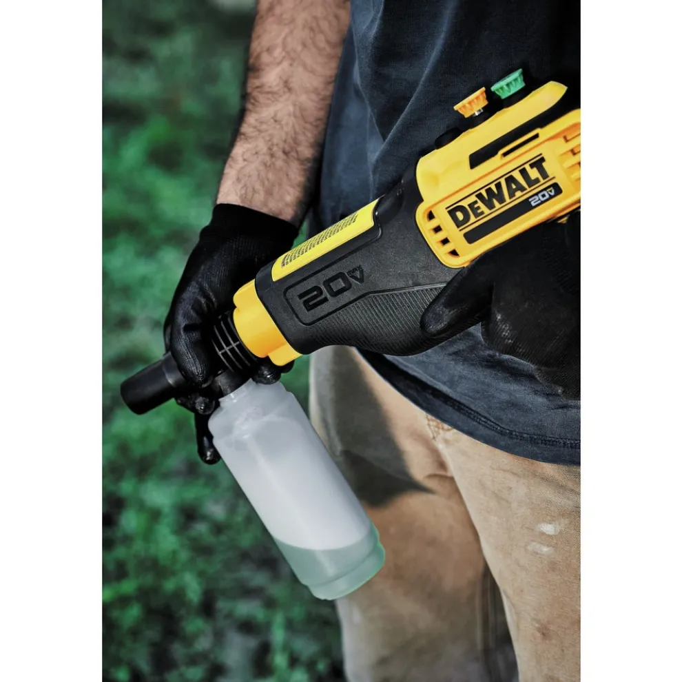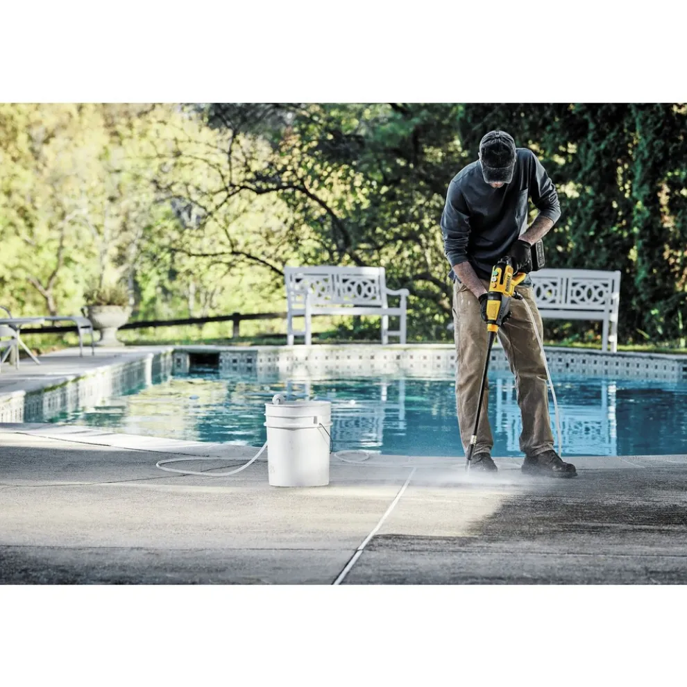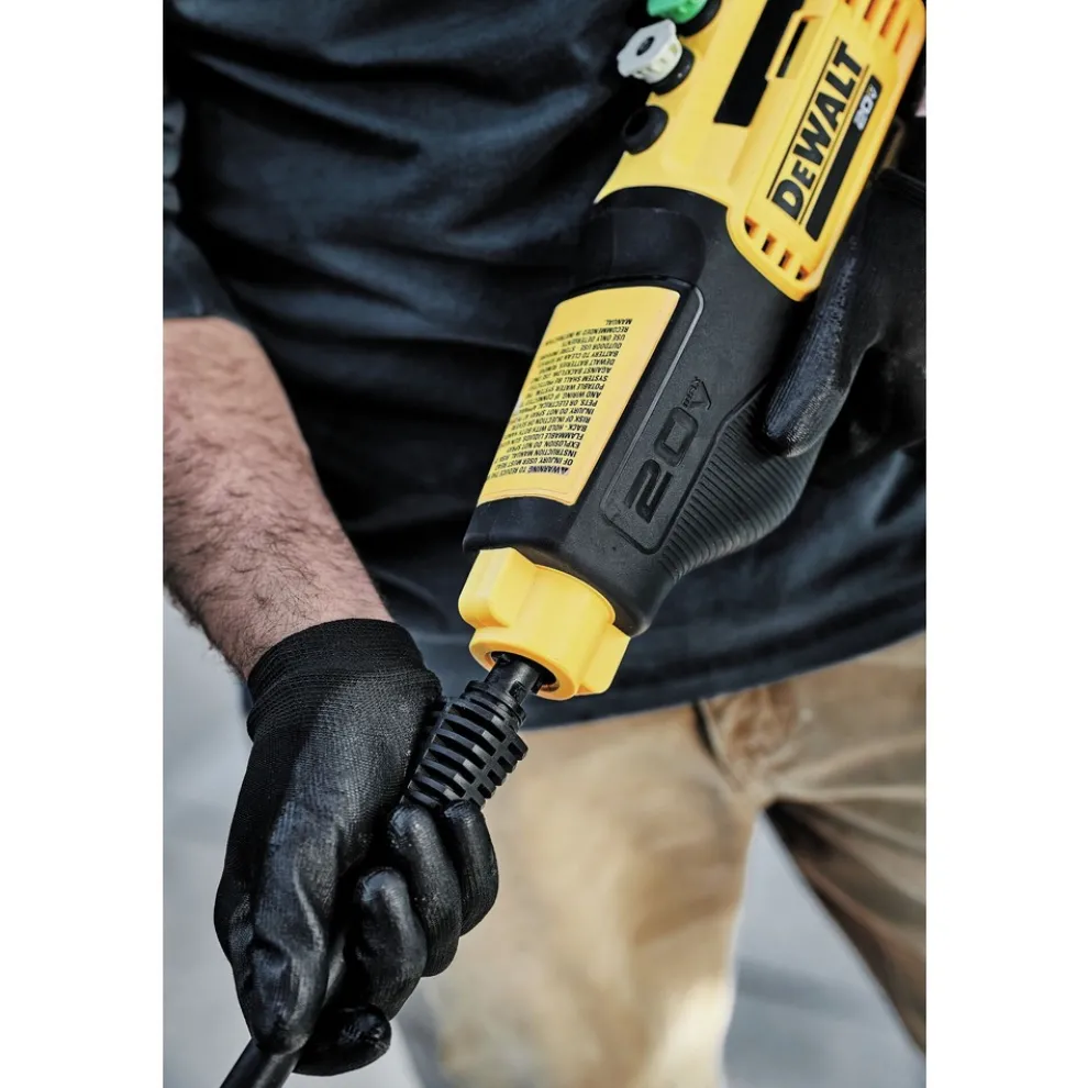 Portable cleaning on the jobsite or at home with 10X the cleaning power of a garden hose with the DEWALT 20V Max Power Cleaner. This tool can draw from any fresh water source with an included suction hose where a garden hose is not easily accessible. It can also be hooked up to your garden hose at home or on the jobsite with the convenient quick connect adaptor. This tool is ideal for convenient cleaning of tools and equipment as well as decks, boats, outdoor furniture and vehicles. It comes with 4 Nozzles that all stored on the unit as well as a soap bottle to cover all your cleaning tasks. Part of the 20V Max DEWALT system this tool will be a great addition to your collection.