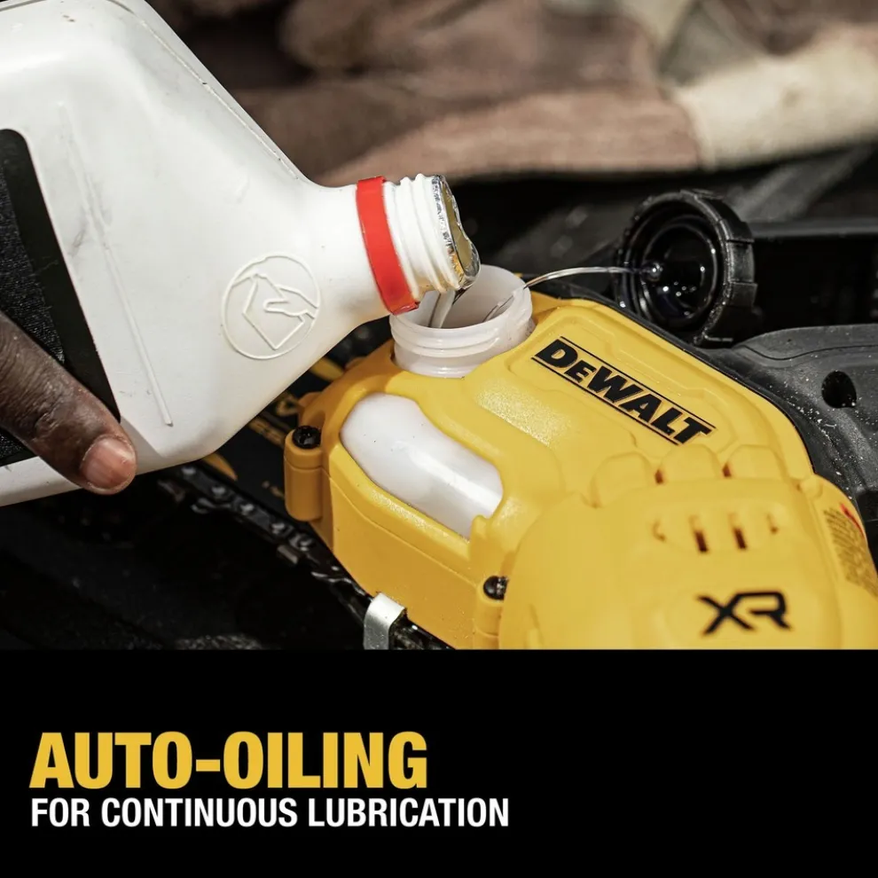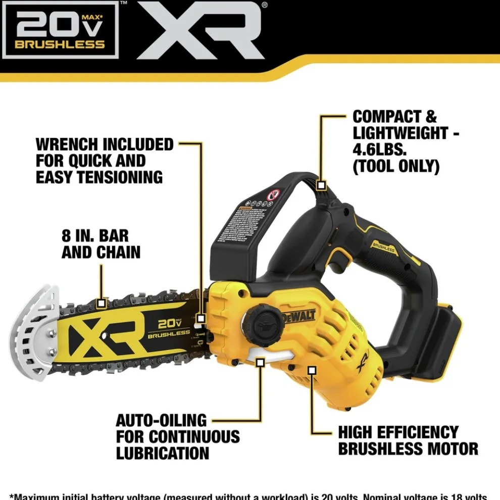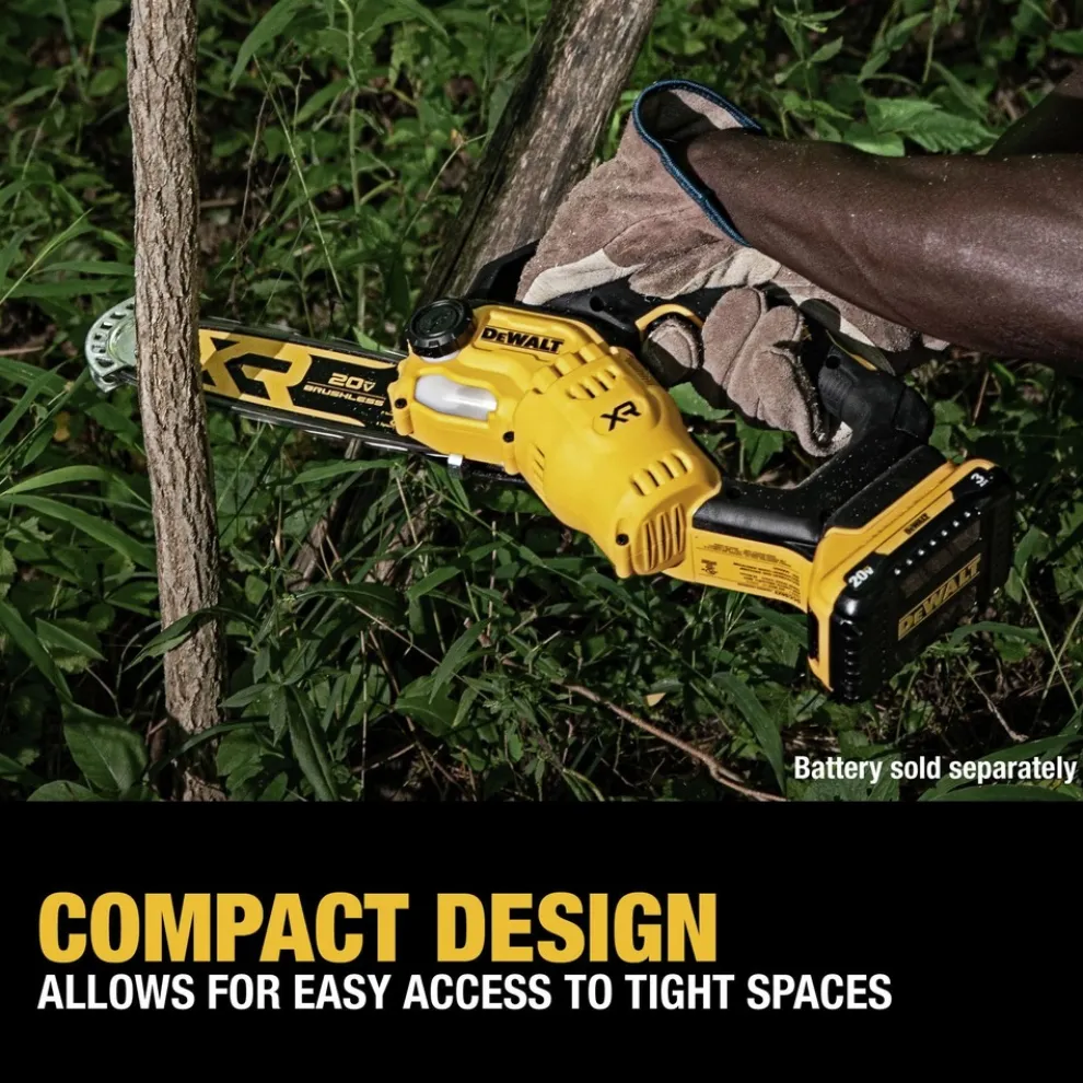 Lightweight and compact, the 20V MAX 8 in. cordless pruning chainsaw has a high-efficiency brushless motor designed to maximize runtime and motor life. Weighing just 4.6 lbs. (tool only), the pruning chainsaw is 61% lighter and 3x more compact, designed to reduce fatigue while cutting, trimming, and pruning. Use it to trim branches from downed trees, cut bundles of wood or branches, and manage thick brush or daily pruning needs. Compact design allows for easy access to tight spaces. Integrated tip guard is designed to provide stability during upcuts, and onboard wrench allows for fast, easy tensioning. Battery and charger sold separately.