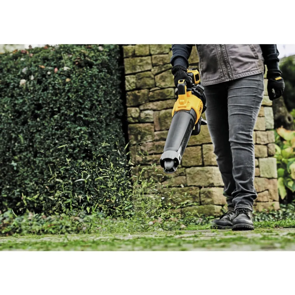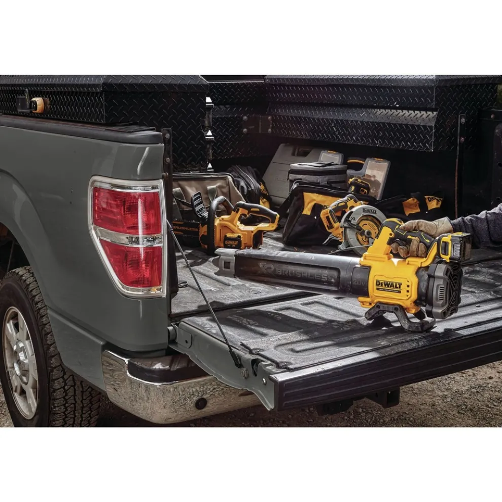 The 20V MAX Brushless Handheld Blower provides the ability to clear debris with an air volume of up to 450 cu-ft. per minute and up to 125 miles per hour with the concentrator nozzle. With a lightweight and ergonomic design, the blower gives users directional control and tackles user fatigue. The variable speed trigger and speed lock give the user full power control.