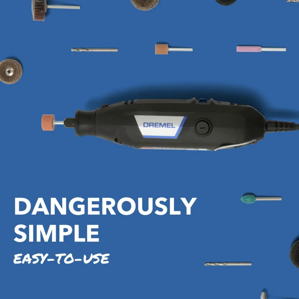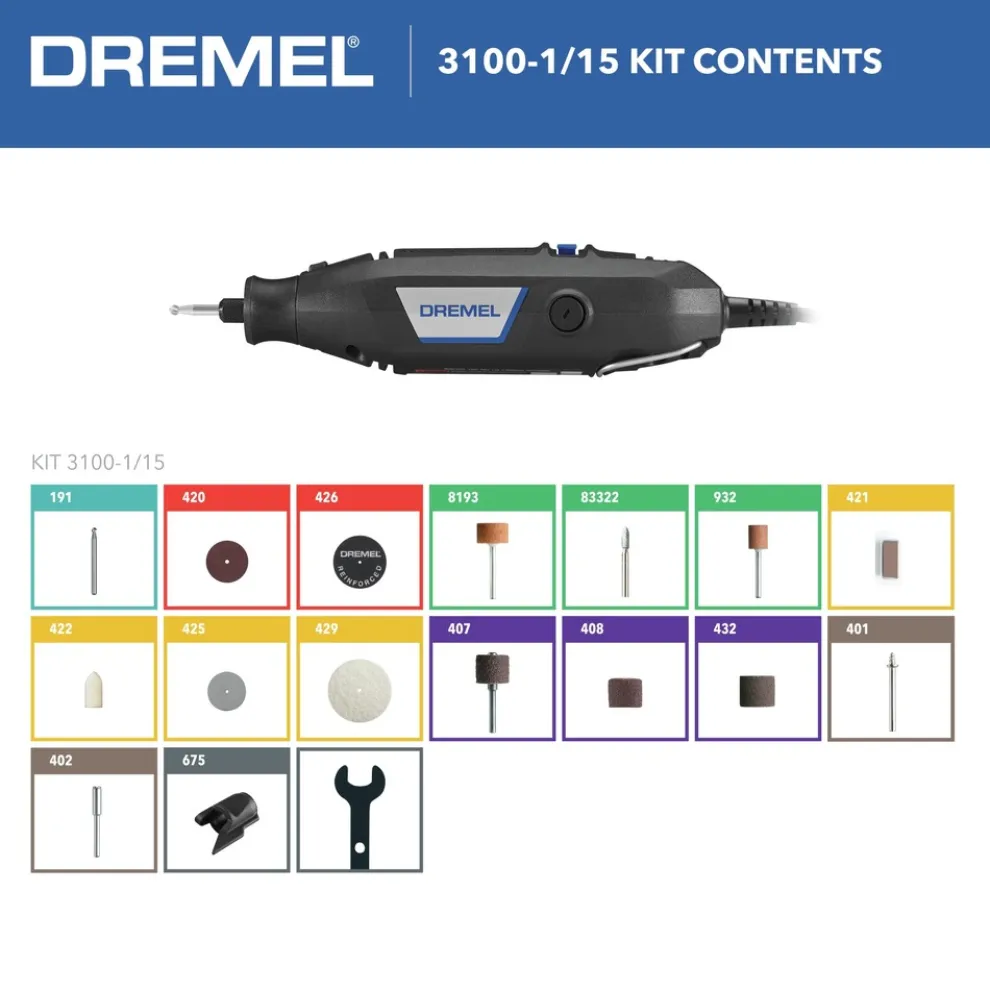 Easy to use – Introducing the Dremel 3100, a tool that combines simplicity with exceptional performance. It’s compact and lightweight, making it easy to handle. At just 7.5 in. long and weighing approximately 20 oz, it’s one of the smallest tools available, ensuring easy portability and use. Effortless power – Harness the power with ease. The Dremel 3100 features a 1.2 Amp motor with 5 speed settings ranging from 5,000 to 35,000 RPM. Its flexible 6 ft. cord allows for continuous performance with no downtime. Optimized airflow and upgraded ventilation prevent heat build-up, ensuring smooth and cool operation. This tool is your reliable sidekick for basic DIY tasks. Seamless compatibility and easy expansion – Compatible with all Dremel accessories and attachments, this tool handles a wide range of applications, from cutting to sanding. The innovative EZ Twist nose cap, with a built-in key, makes accessory changes quick and easy, eliminating the need for a wrench. Easy on environment – We are proud to advance our sustainability efforts with the Dremel 3100. The product housing uses > 65% recycled plastic. The packaging is entirely polybag-free, the tool kit is contained in a fully recyclable carton, further reducing environmental impact.