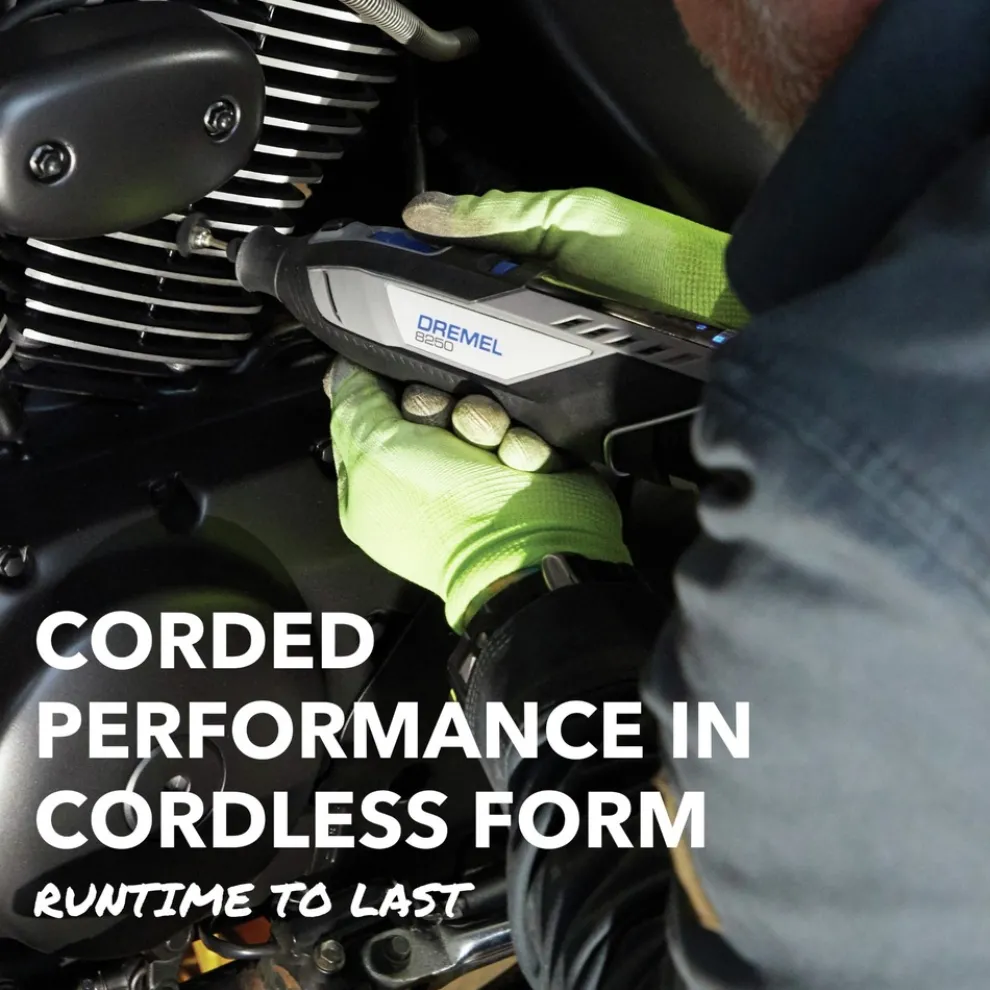 Brushless power to perform, runtime to last. From cutting to sanding, and grinding to drilling the Dremel 8250 delivers corded performance without the inconvenience of a cord. Featuring an advanced brushless motor, the 8250 provides optimized motor efficiency, more runtime and power, and long tool life. With 20% higher power vs Dremel’s most powerful corded tool the 4300, the 8250 provides maximum versatility to perform the widest range of applications and is compatible with all rotary tool accessories and attachments. The powerful 12V / 3 Amp Lithium-Ion battery provides superior performance and runtime at all speeds; delivering 100% more runtime vs the 8220 ensuring that the 8250 will still be going strong when you need it. The innovative tool design is engineered to exceed endurance tests for consistent and powerful performance every time, while the ergonomic body provides a comfortable grip zone making it ideal for extended use. The 8250 gives you the confidence and performance to tackle the toughest of jobs.