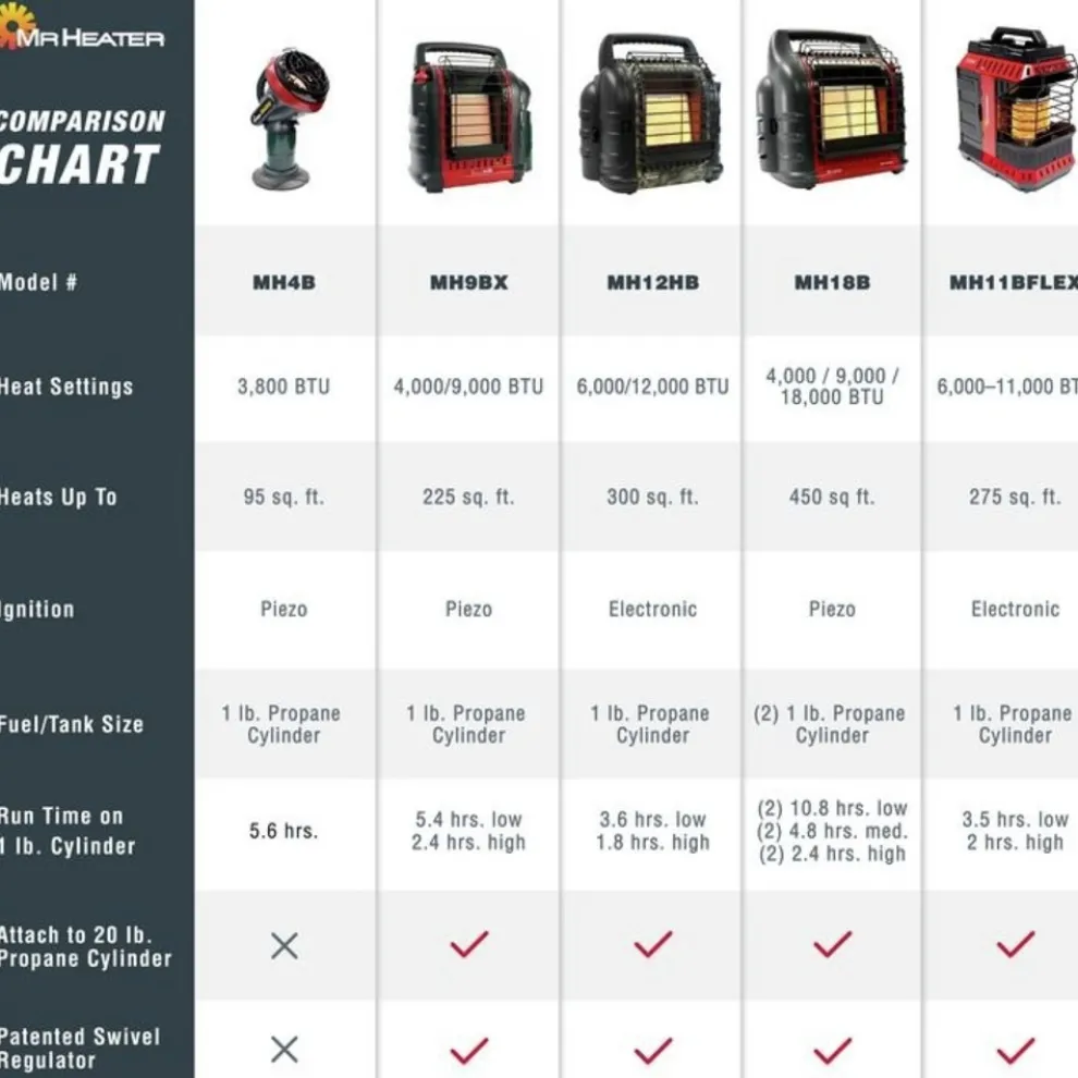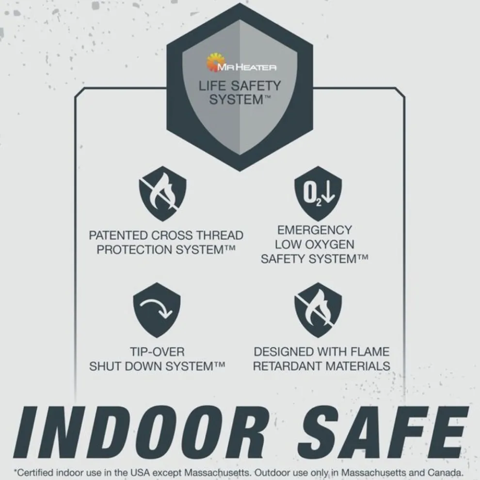 This heater is safe for indoor use in small recreational enclosures having means for providing combustion air and ventilation, such as enclosed porches, cabins, fishing huts, trailers, tent trailers, tents, truck caps and vans. It may be used for emergency indoor heating when connected to a disposable 1 lb. propane cylinder, and can also be connected to a 20 lb. propane tank with the optional connector hose (Sold Separately).