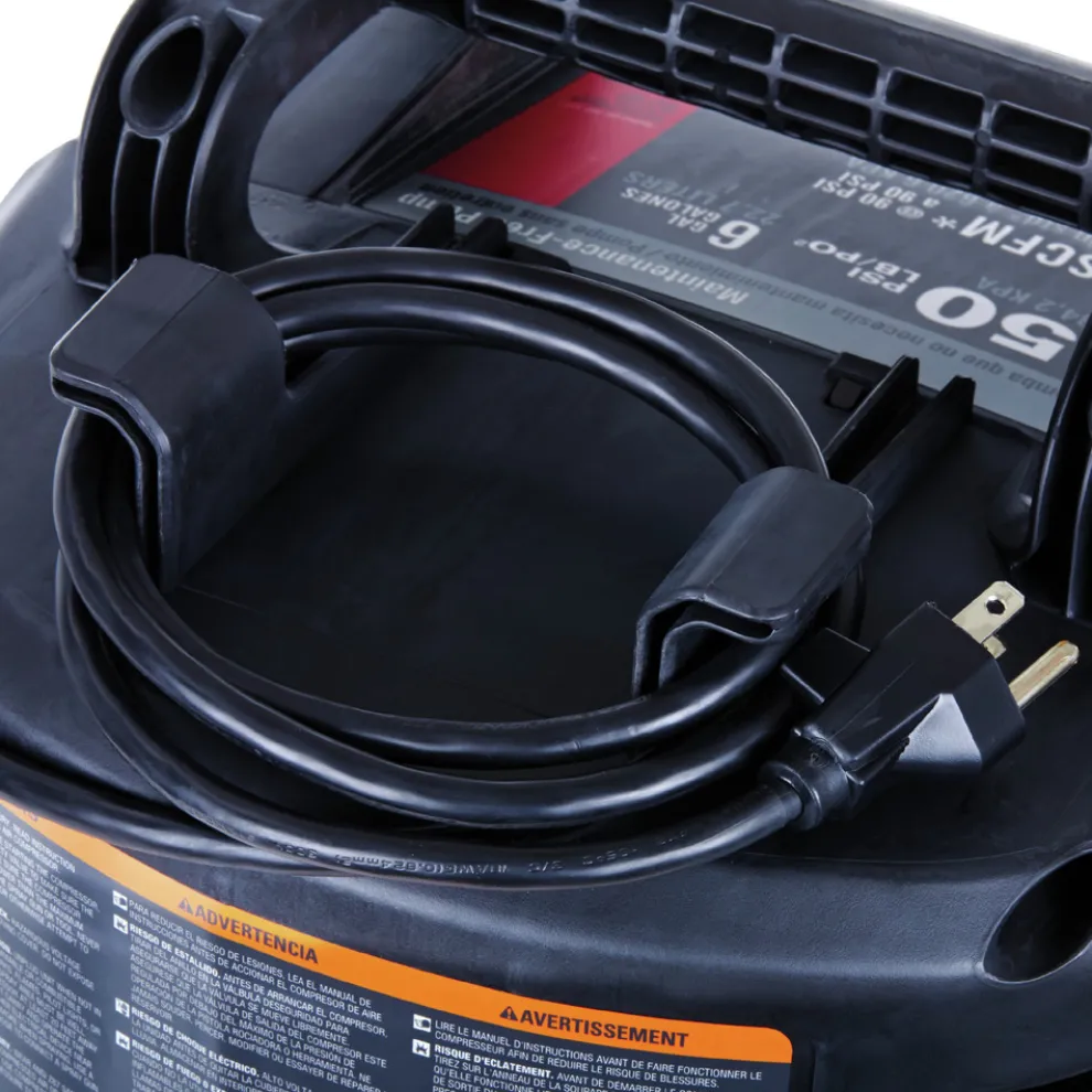 Our 150 PSI 6-Gallon Oil-Free Pancake Compressor is constructed with a pancake style tank for stability, with a water drain valve and tough rubber feet. The high-pressure design optimizes air tool performance, delivering 2.6 SCFM at 90 PSI for quick recovery time. The oil-free pump provides maintenance-free performance. Transporting is easy with the integrated cord wrap.