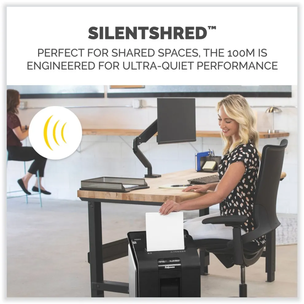The 100M features a versatile FlexShred capability that shreds up to 100 sheets automatically or 10 sheets manually. Shred credit cards, paper clips and staples using the manual slot. The micro-cut P-4 security level provides superior protection with shreds 6X smaller than standard cross-cut. The 100M shreds for 15 minutes before a cool down period is needed. The SilentShred feature offers ultra-quiet performance for shared workspaces. Auto Reverse stops and reverses paper if a jam occurs. The Sleep Mode shuts down the shredder after 2 minutes of inactivity to save energy. A spacious 6-gallon pull out bin eliminates the need for frequent emptying.