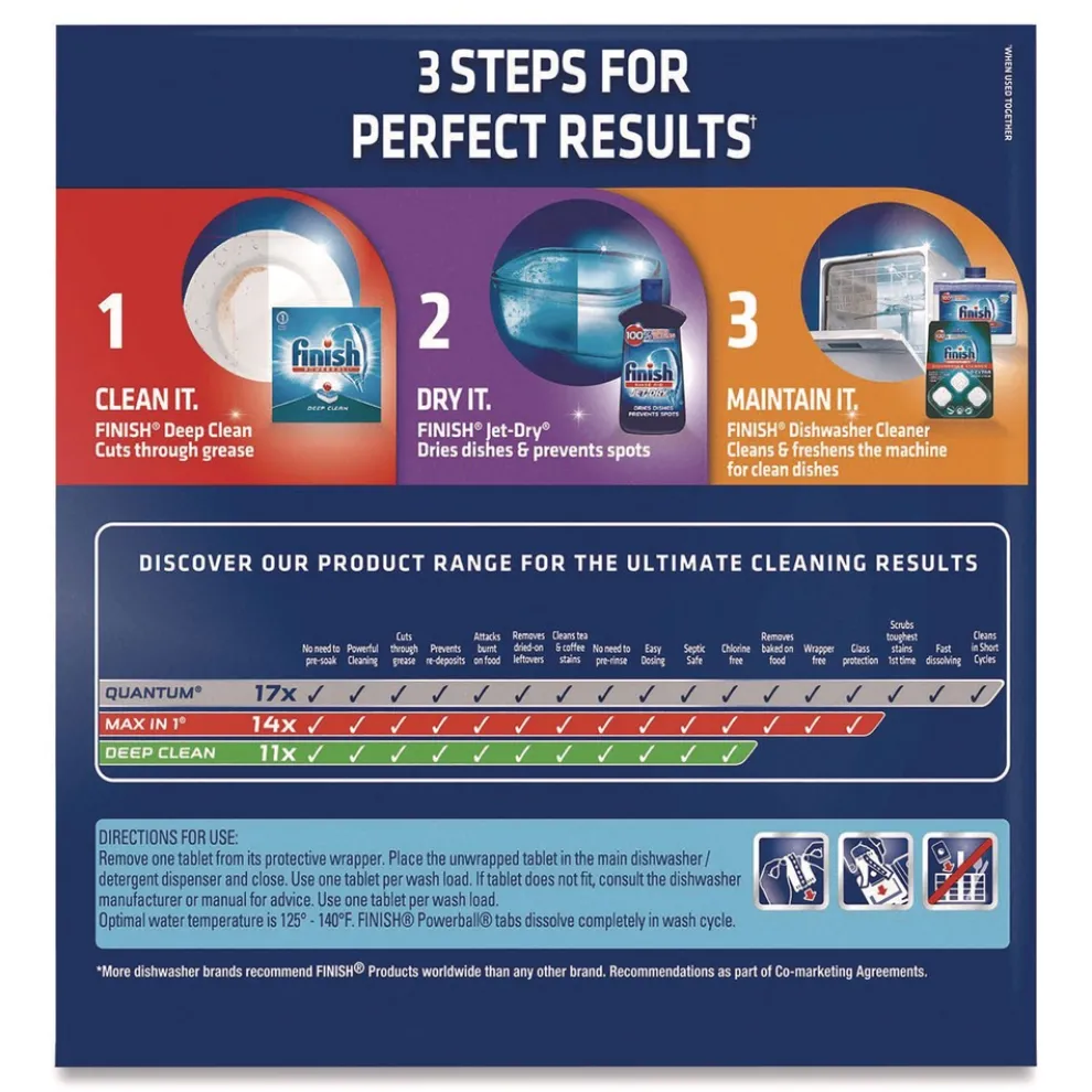 All-In-One dishwasher detergent tablets give you an amazing clean and shine-which means you will never have to re-wash your dishes again. Our Powerball supercharges the tablet, bursting into action to scrub away the toughest food residues like dried-on food, such as lasagna and oatmeal. Our powerful cleaners remove even the toughest stains, like coffee and tea, and gently scrub your dishes and glasses sparkling clean. All-In-One tablets (individually wrapped and pre-measured) are safe for septic systems.