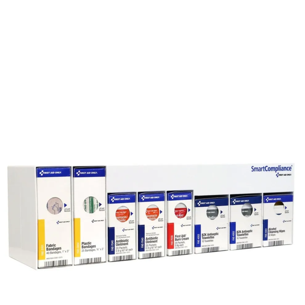 This unique Clean, Treat and Protect station treats minor cuts and scrapes with easily replaceable SmartCompliance boxes. The station mounts to most vertical surfaces without drilling using strong foam adhesive tape. Individual bandage and ointment packets are easy to use and eliminate potential for cross contamination Each antiseptic pad is saturated with Benzalkonium Chloride to help prevent infection in minor cuts, burns and scrapes. The station features both fabric and plastic adhesive bandages which are ideal for minor cuts, abrasions and puncture wounds. The single use topical antibiotic ointment packets help to prevent infection in minor cuts scrapes and burns.
