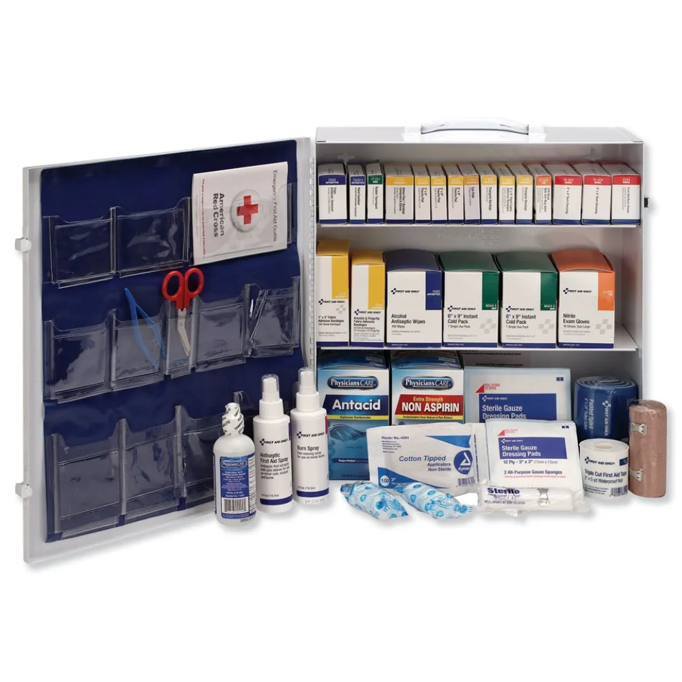This industrial first aid station is designed as an auxiliary kit for smaller businesses, offices and work sites. Contains a variety of products to take care of cuts and scrapes, eye irritations, CPR rescue, personal discomfort, minor burns, sprains, strains and bruises. The swing-down door and easy-to-carry handle make this first aid station extra convenient. Refills are color-coded for easy identification in an emergency. Conveniently wall-mountable and made of sturdy metal.