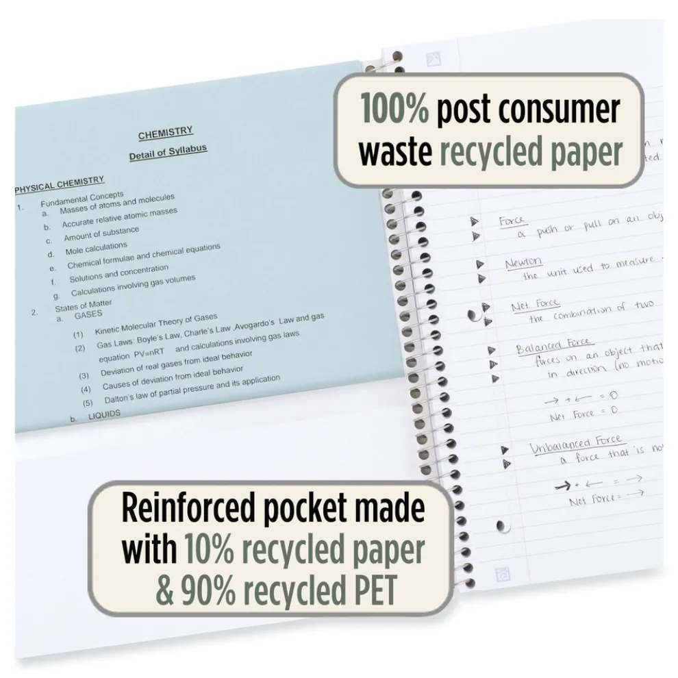Choose the Five Star Recycled Notebook this year, it gives you plenty of space to organize and jot down notes all year long. Lasts all year–guaranteed! Scan, study and organize your notes with the Five Star App. Create instant flashcards and sync your notes to Google Drive to access them anywhere from any device. Tough two-pocket divider resists tearing. Neat Sheet perforated pages make it easy to tear out assignments. Spiral Lock wire binding prevents coil snags on your clothes or in your backpack. Notebook is recyclable–just remove the reinforcement tape on the pocket and recycle the rest!