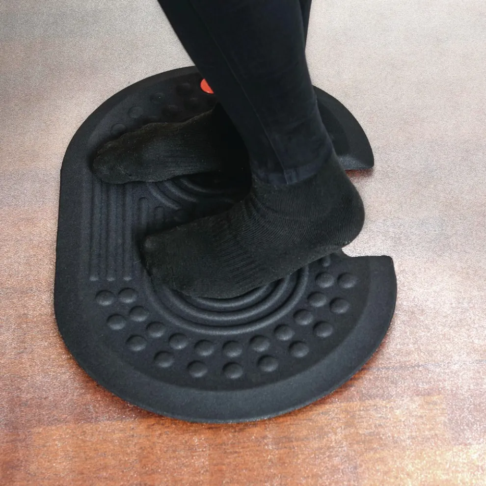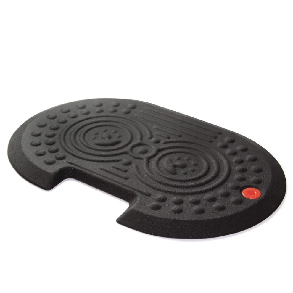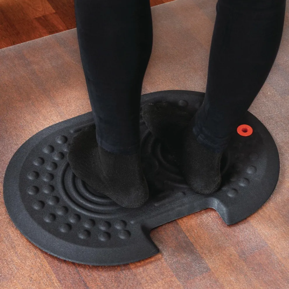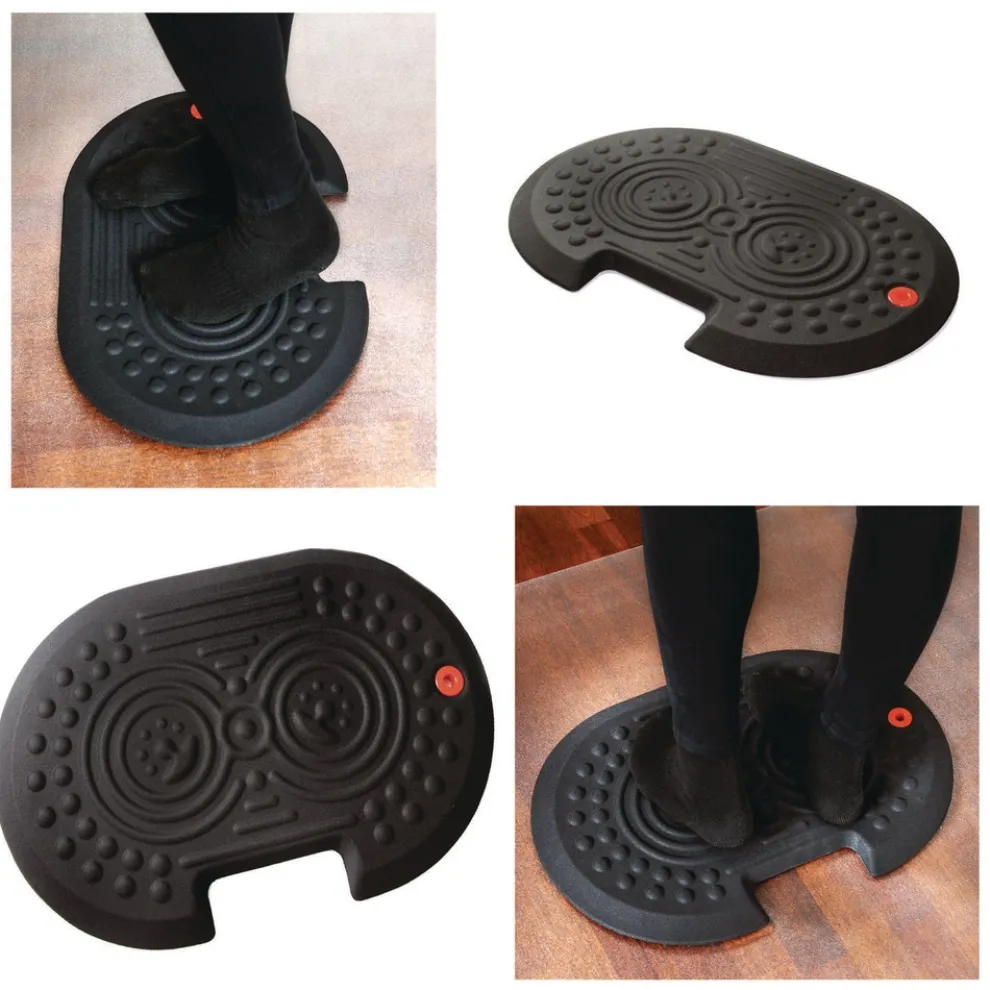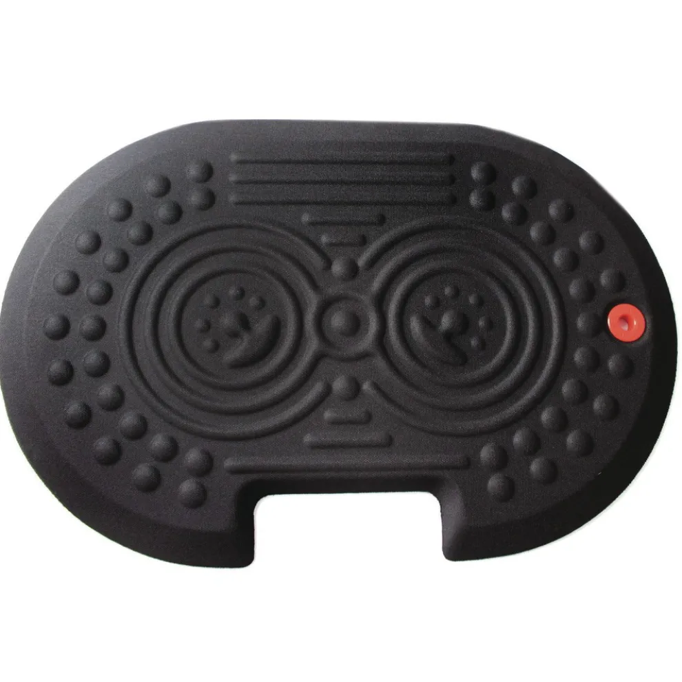 Ergonomic standing surface includes contoured foot massage features which encourage regular foot movement and changes in standing position that stimulate blood flow for reduced fatigue