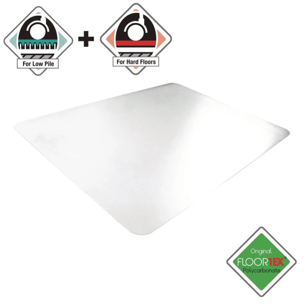 Made from original Floortex polycarbonate. Our premium plastic mats are incredibly tough and durable with twice the impact strength of vinyl to provide a perfectly flat and rigid ergonomic easy glide roll surface. Material as used in aircraft windscreens and bulletproof glass