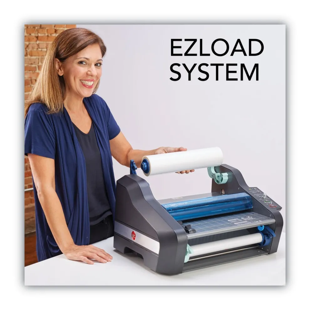 Laminator is compatible with GBC EZ Load blue end cap roll film: 1.7 to 5 mil thickness, 12″ max roll width, 1″ core