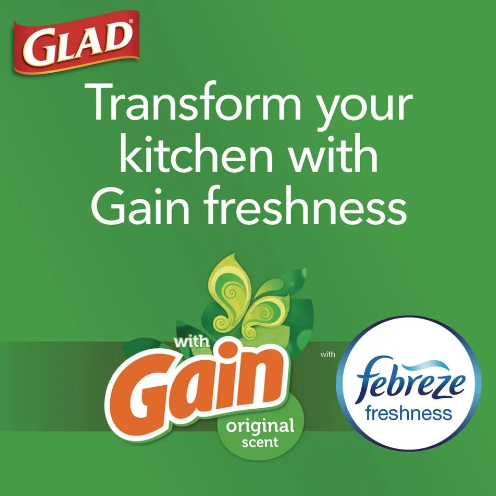 Fight nasty kitchen odors with Glad trash bags. Glad Kitchen Drawstring Trash Bags are designed with ForceFlex technology to give extra flex as it expands around sharp edges and heavy loads, so you can pack it in while resisting tears, rips and punctures. Keeps your kitchen smelling pleasantly fresh with long lasting odor control. Let the stretchable strength of Glad handle all the messes our busy daily life can throw at it and then some. With double-sided seals and a reinforced bottom, these bags are designed with RipGuard and LeakGuard technology to prevent seepage of liquids and keep trash contained. The durable Grips-The-Can Drawstring ensures a tight grip on the trash can to keep it in place. Take the trash to the curb with no fear of leaks and tears, and no frustration. Keep your kitchen smelling clean with the stretchable strength of Glad. Ideal for use in offices, schools, daycare centers, restaurants, hotels and other commercial facilities.