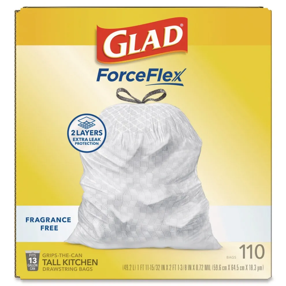 Glad 22541 ForceFlex Kitchen Drawstring Trash Bags, Drawstring, 13 gal, Unscented, 23.47 x 25.38, White, 110 Bags/Box, 3 Boxes/Carton