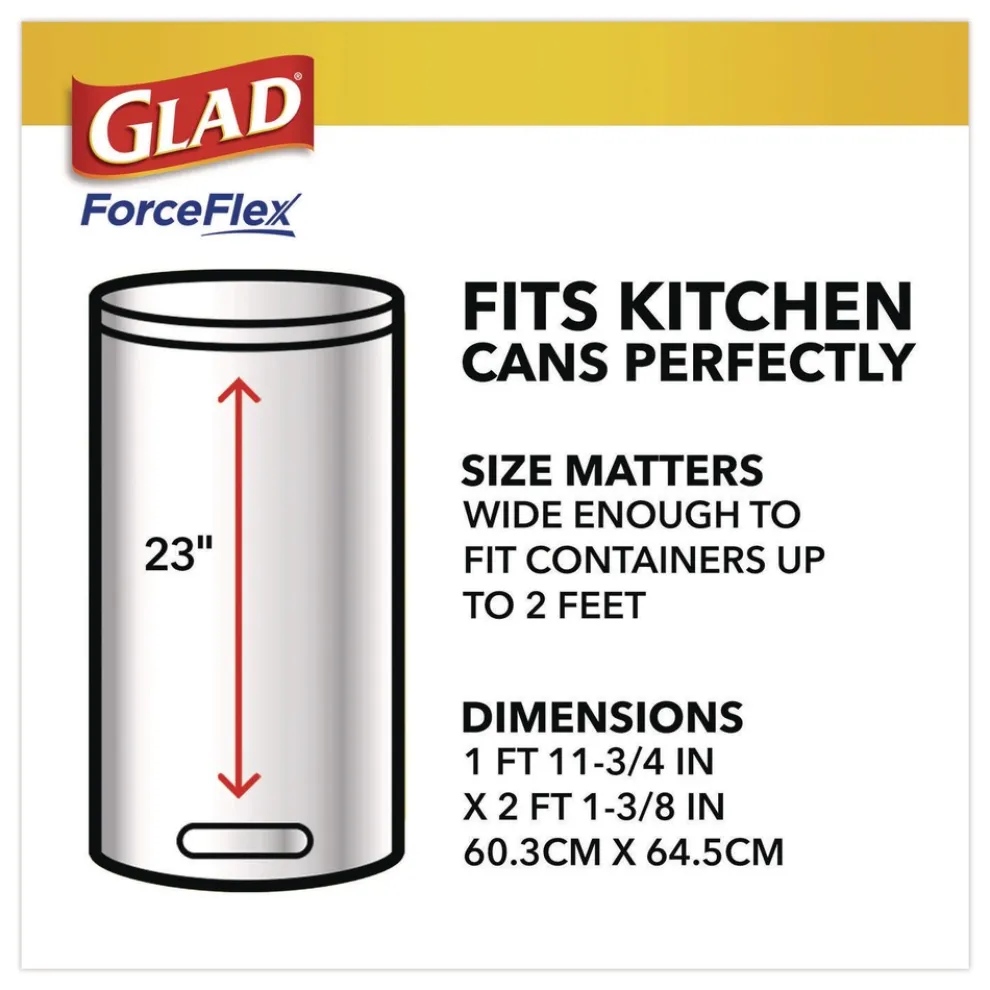 Fight nasty kitchen odors with Glad trash bags. Glad Kitchen Drawstring Trash Bags are designed with ForceFlex technology to give extra flex as it expands around sharp edges and heavy loads, so you can pack it in while resisting tears, rips and punctures. Keeps your kitchen smelling pleasantly fresh with long lasting odor control. Let the stretchable strength of Glad handle all the messes our busy daily life can throw at it and then some. With double-sided seals and a reinforced bottom, these bags are designed with RipGuard and LeakGuard technology to prevent seepage of liquids and keep trash contained. The durable Grips-The-Can Drawstring ensures a tight grip on the trash can to keep it in place. Take the trash to the curb with no fear of leaks and tears, and no frustration. Keep your kitchen smelling clean with the stretchable strength of Glad. Ideal for use in offices, schools, daycare centers, restaurants, hotels and other commercial facilities.
