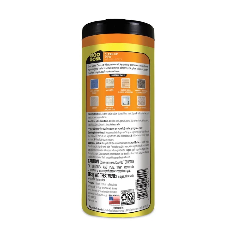 Harness the cleaning power of Goo Gone in a convenient wipe. Eliminate your sticky, gooey, gummy problems without harming your surface. The gentle, non-abrasive formula is safe for daily use. Safe for use on latex painted walls, wallpaper, wood flooring and furniture, laminate flooring and countertops, carpet, ceramic tile, glass, stainless steel and granite. Tough task wipes are recommended for cleaning scuff marks, masking tape residue, ink spills, paint tree sap, stickers, gum, glue, markers and crayon. Ideal for quick clean-ups, with an easy to take on-the-go canister. Citrus powered cleansing wipes get the job done without damage.