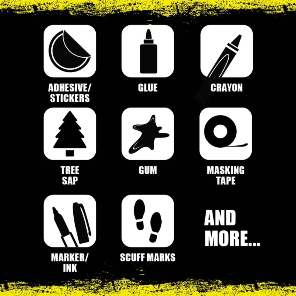 Great for cleaning scuff marks, masking tape residue, ink spills, paint tree sap, stickers, gum, glue, markers and crayon