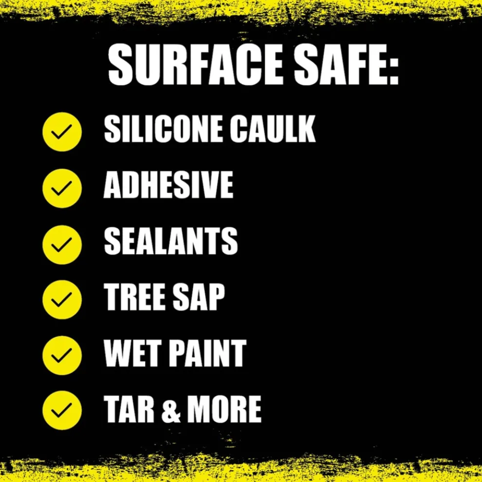 Removes silicone caulk, contractor’s adhesive, grease, tar, tape, tape residue, varnish, wax and glue