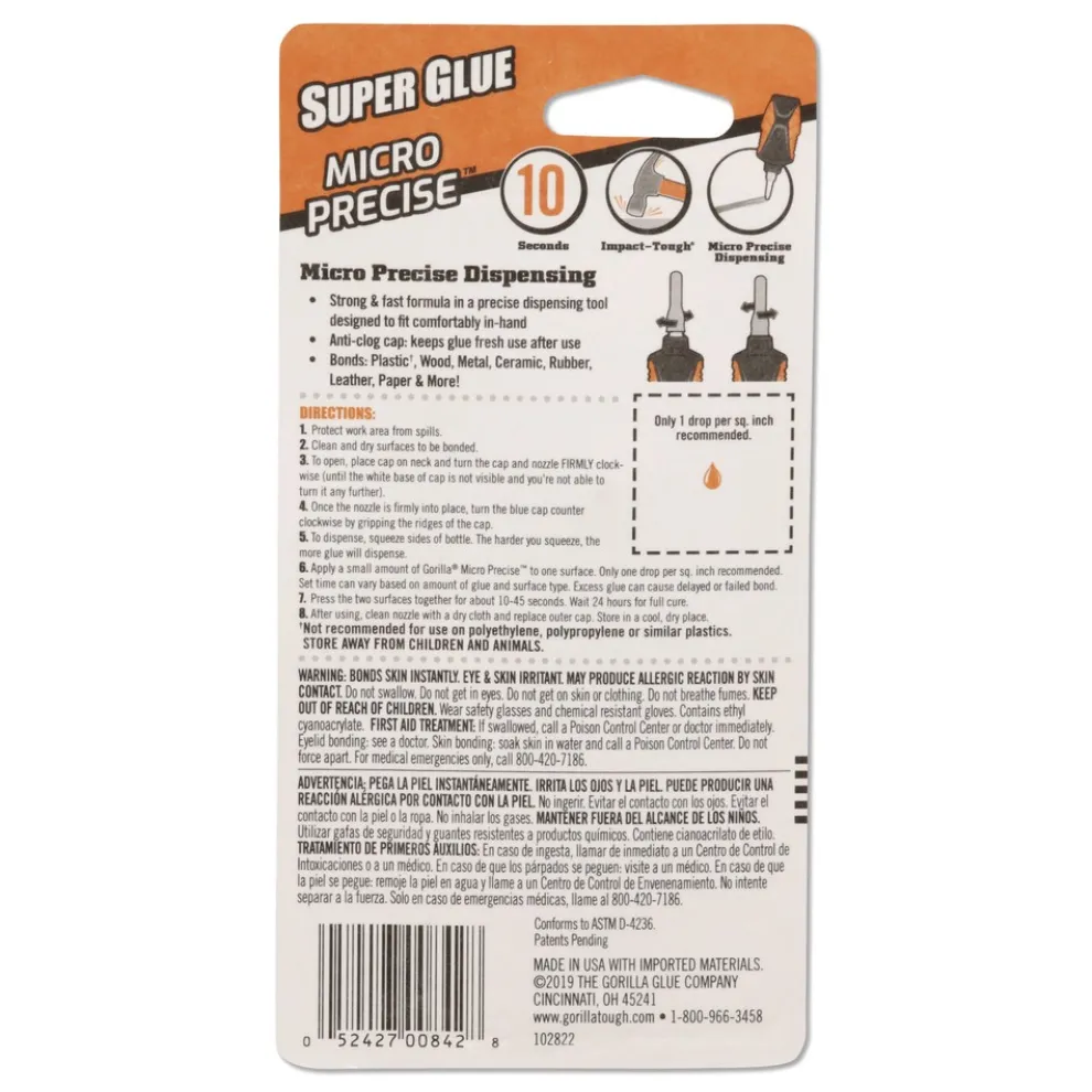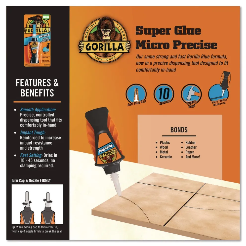 Our same strong and fast Gorilla Super Glue formula, now in a precise dispensing tool designed to fit comfortably in-hand. Gorilla Super Glue Micro Precise provides an easy-to-use, precise application experience that allows you to apply only the amount of glue you want, exactly where you need it. Like our other Super Glue products, Micro Precise has an anti-clog cap with a metal pin inside, ensuring an airtight seal for maximum reusability. For the toughest jobs on planet earth.