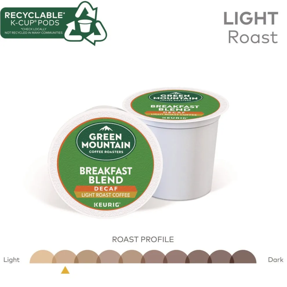 Breakfast Blend Decaf is our classic New England breakfast cup. Breakfast Blend Decaf offers a crisp Central American coffee matched with the depth of an Indonesian bean to create a bright, wakeful blend. The mountains are a special place. It’s where Green Mountain was born. It’s where this adventurous spirit and commitment to improving the lands through sustainably sourced coffee was developed. Green Mountain is driven to bring the world a richer, better cup of coffee. Be bold. Be alive. Grab a cup, and get out there. The Green Mountain Breakfast Blend is as eye-opening and delightful as the dawn itself. Clean and bright, with balanced sweetness, nutty flavor, and a silky mouthfeel. Made with 100 percent arabica coffee. This single-serve K-Cup pod is compatible with all Keurig K-Cup pod single-serve coffee makers. This K-Cup pod is filled with the freshest ground coffee and brews a perfect, great-tasting cup of coffee every time. What does being 100 percent responsibly sourced coffee mean? Responsibly sourced means the coffee is grown and sold in adherence to a credible sourcing program that aligns with Green Mountain’s responsible sourcing guidelines. This coffee is 100 percent responsibly sourced. Introducing recyclable K-Cup pods: simple, delicious, and now recyclable. Enjoy the same great-tasting coffee you know and love, and when you’re done, just peel, empty, and recycle.