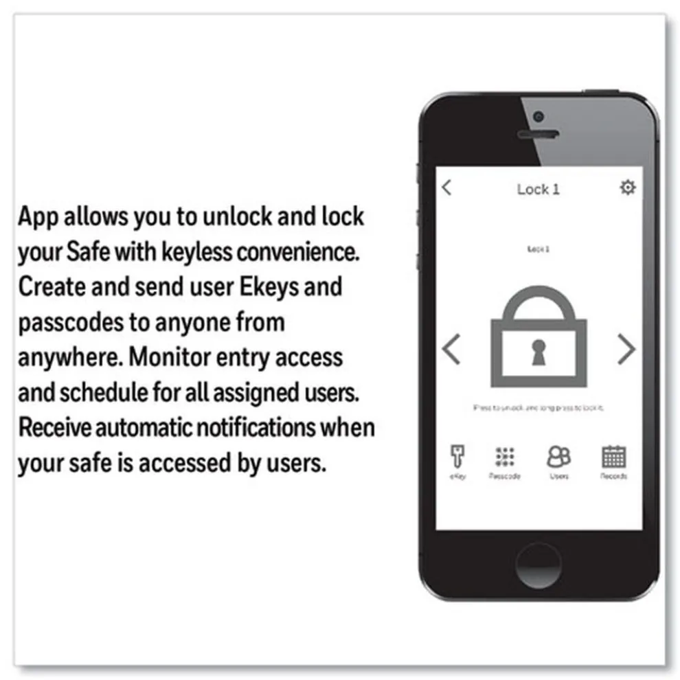 This security safe features Bluetooth enabled access via the Honeywell app, as well as customizable passcodes that can be used as another form of entry. The sleek touchscreen features a large screen with digital numbers and icons that illuminate when touched. Temporary or permanent codes and eKeys can be created to share for multiple user access. For audit control, the Bluetooth signal sends instant alerts to administrator when codes or eKeys are used to gain entry to the safe. In the event of an emergency, this digital safe also comes equipped with two unique manual keys. The durable design of this electronic safe has a scratch-resistant and powdered-coated finish with two motorized locking door bolts. The edge of the door is curved to bolster resistance against theft. The interior features a base carpet and an LED light strip. A removable shelf has been included for enhanced storage capacity. For additional security, an optional bolt down kit can be used to secure the Bluetooth safe to a stationary surface.