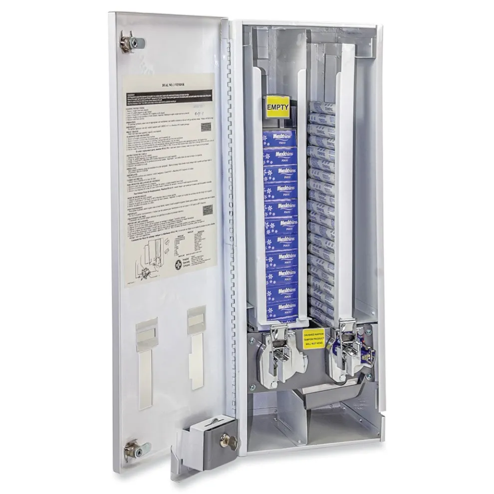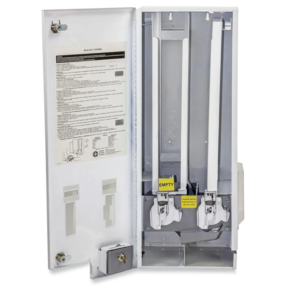 Coin operated dual slots. All-metal construction. Holds 15 #4 napkins and 22 Tampax tampons (sold separately). Separate locks for supplies section and coin box.