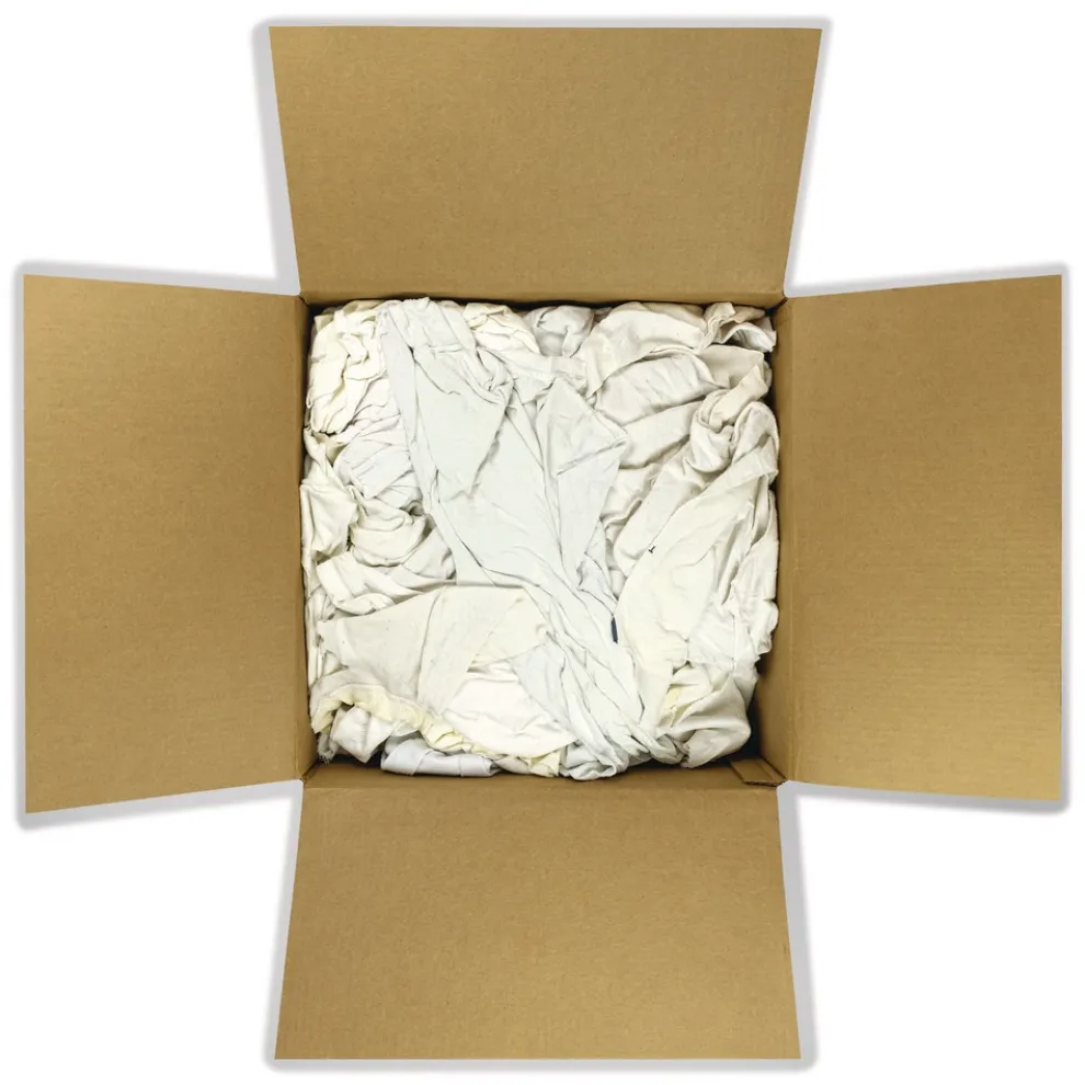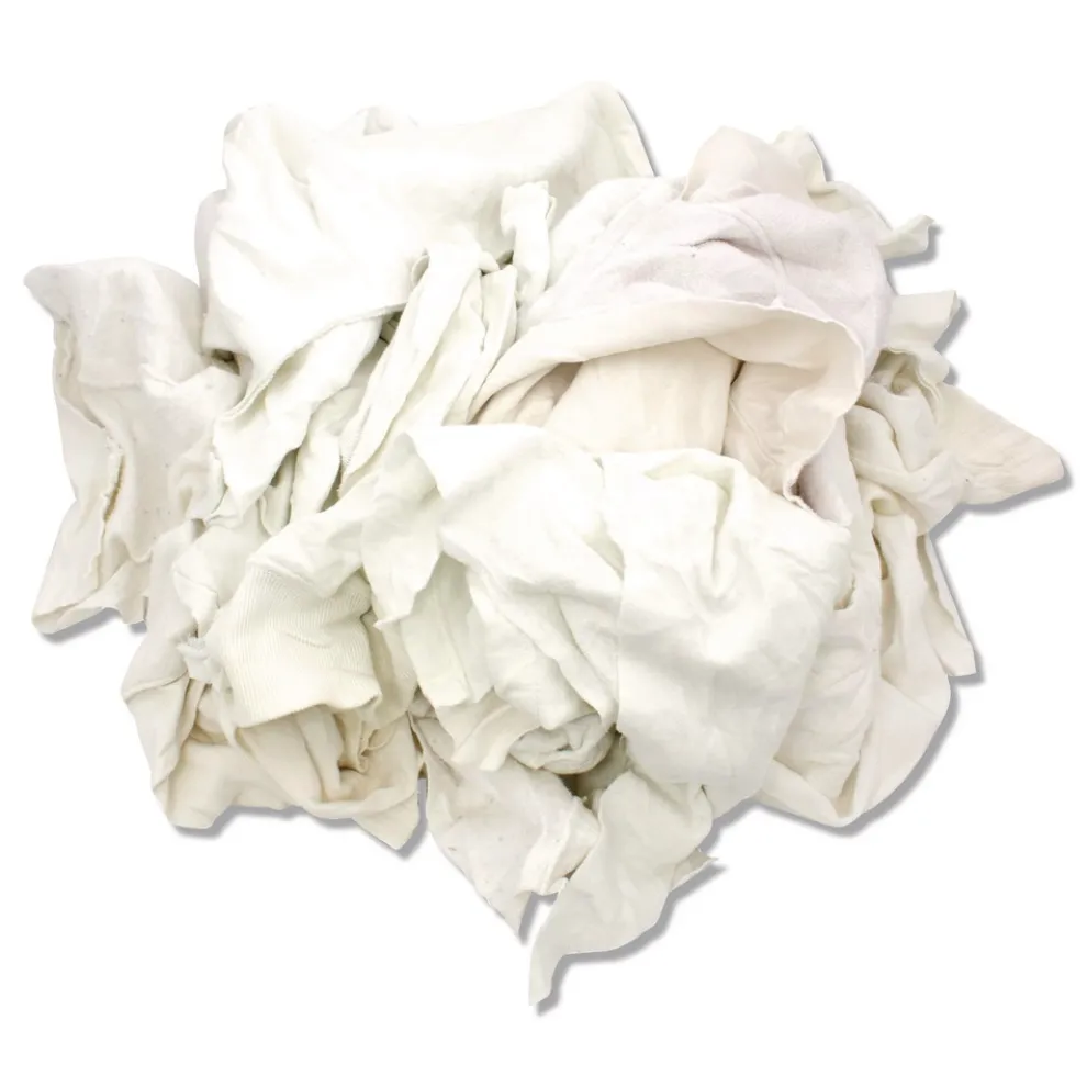 Reclaimed white sweatshirt wipers for heavy-duty cleaning and large spill pick-up. Excellent for grease and oil.