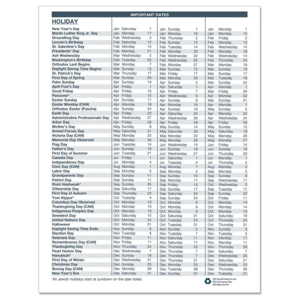 Stitched-book-style flat planner, with room to record necessary appointments and general information, is ideal for the busy professional. One-month per two-page spread with generous note space for important information. Lightly ruled daily blocks help keep notations neat. Includes numbered weeks. Additional information sections include important holiday dates, a three-year reference calendar and a lined contact-information page. Made entirely of recycled materials.