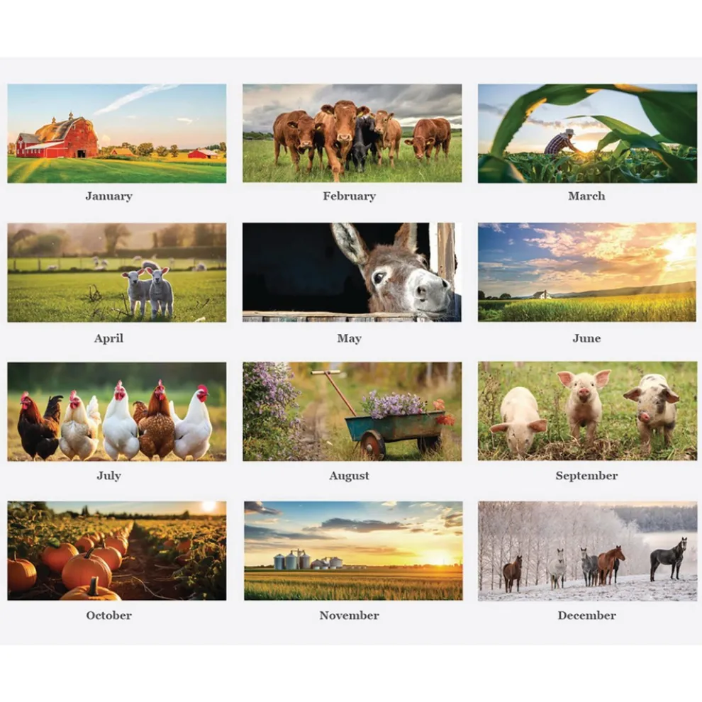 Each month displays full-color farm animals and scenery