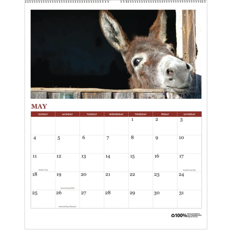 Each month, January to December, enjoy full-color photos of gorgeous farm scenery and animals all year long. The large daily blocks have extra space to jot notes and can be seen from afar. Printed on heavy duty paper with soy inks will endure use all year long. Strong recycled white wire binding firmly keeps the pages together in one place. Includes a wire hanger to easily hang the calendar on the wall.
