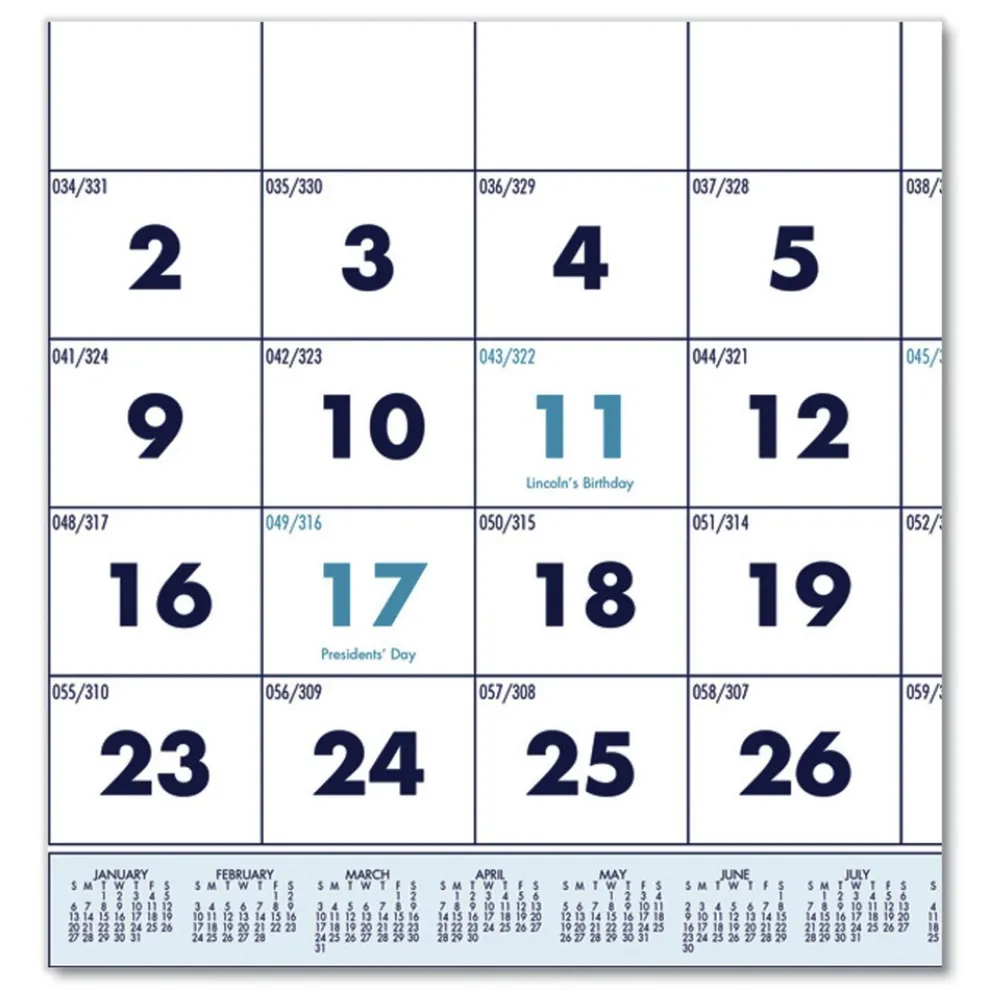 See three months at a time. Wall calendar details the prior, present and following month on each page. Large date numerals with holidays highlighted. Strong wire-binding firmly keeps the pages together and in place. Features a full, 12-month reference calendar for long-term planning. Sturdy wire hanger makes it easy to hang the calendar on the wall. Made entirely of recycled materials.