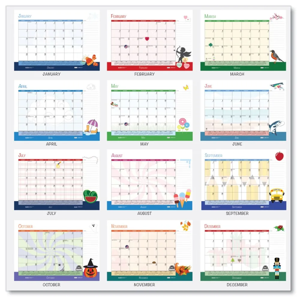 Each month features a different lively design depicting the seasons and holidays for that month.