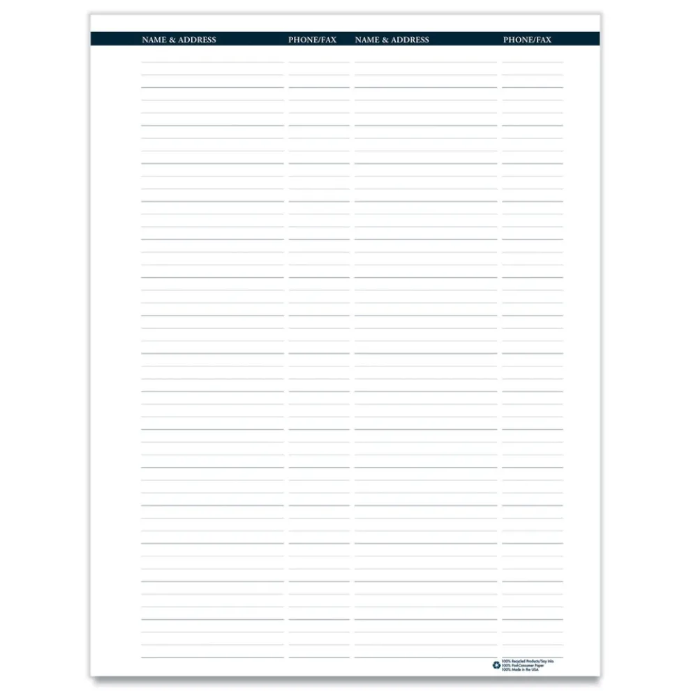 Each monthly two-page spread features a printed indicator for easy reference to allow you to see important dates and reminders quickly. The weekly pages feature one-week view per two-page spread with hourly appointments from 8:00 a.m. until 9:00 p.m., Monday to Sunday. A 2-sided pocket for storing important papers is included. The planner is spiral bound with recycled wire binding and features a sturdy one-piece black embossed leatherette cover to withstand the daily use throughout the year. Printed on recycled paper with soy inks.