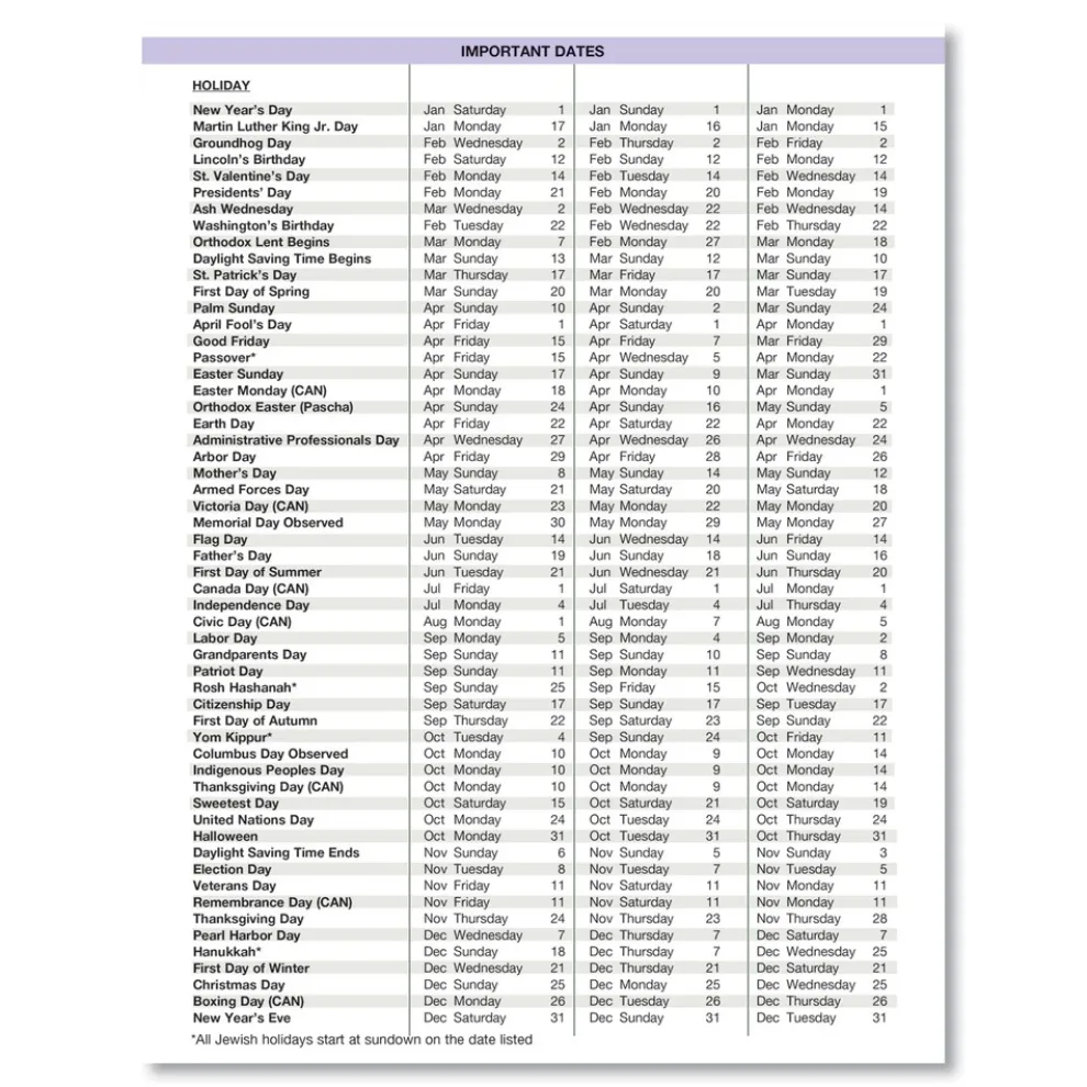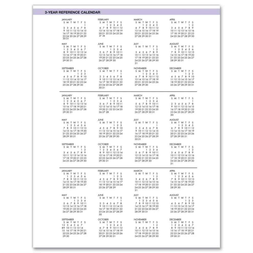Additional page with important holiday dates for three years in list form as well as, three-year calendar reference page for long-range planning.