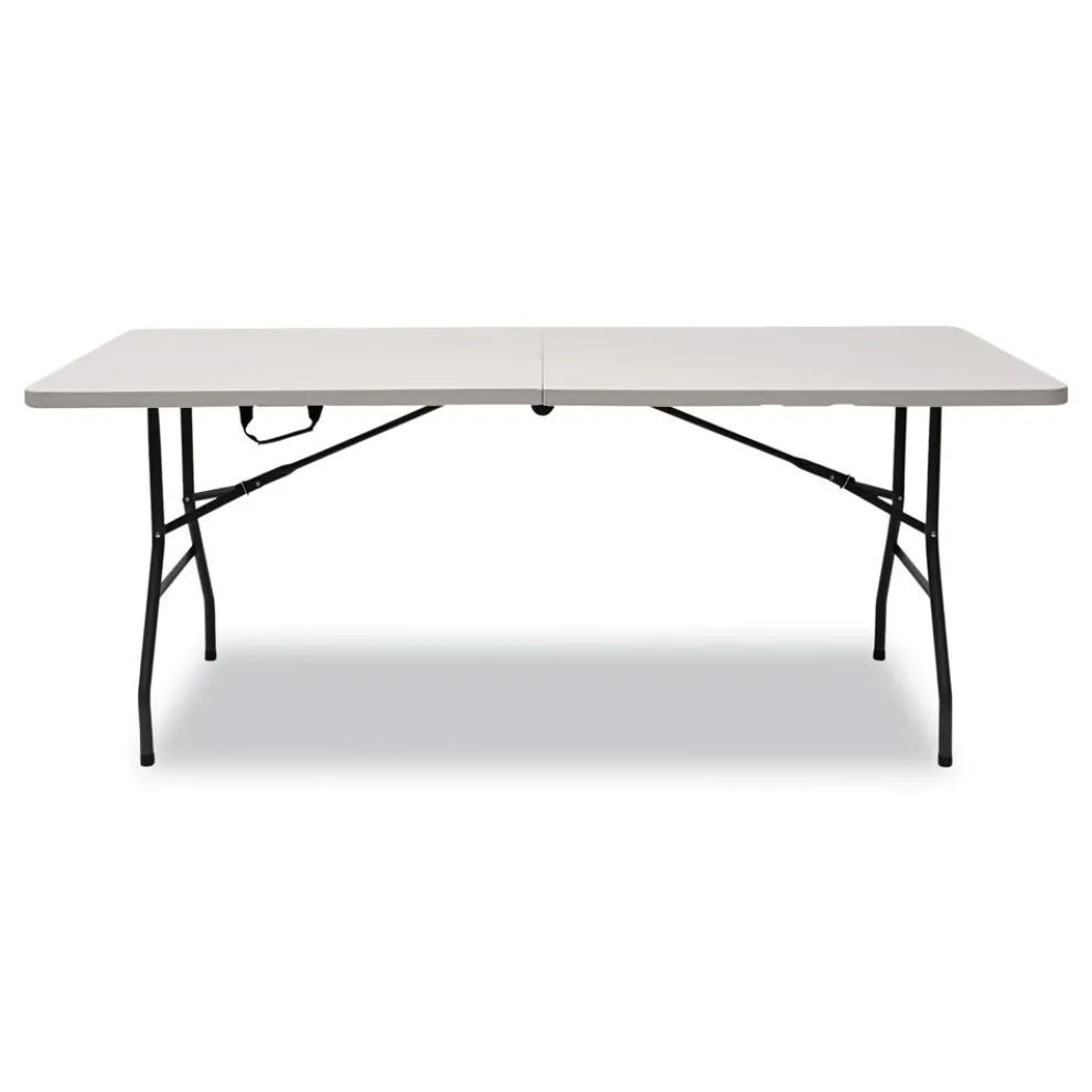 Sturdy in design, contemporary in appearance and surprisingly lightweight, Iceberg Resin-Top Bifold Tables feature a built-in carry handle and a convenient bifold format, where the tabletop folds in half while the legs fold up, to deliver an option that transports easily and stores compactly. Waterproof, scratch- and dent-resistant, the blow-molded, high-density polyethylene tabletop features rounded corners and soft-radius edges which both take away the sharp angles while allowing tablecloths to hang more neatly. Durable powder-coated steel legs with bracing bars ensure a solid, sturdy foundation. If you’re looking for an indoor/outdoor table that’s easy to set-up and take-down for offices, schools, trade shows, fairs, impromptu marketplaces or simply for outdoor parties, weddings and barbequesthese bifold tables might just be ideal.