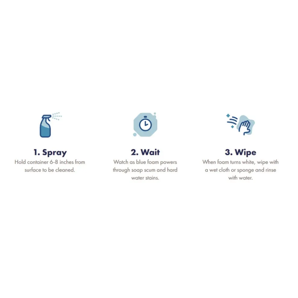 Takes the guesswork out of cleaning. Spray on the penetrating blue foam and OxiClean Stain Fighters go to work on contact, breaking up soap scum and hard water stains. When the foam turns white, just wipe and rinse to reveal a brilliant shine. Cleans with a fresh scent and no obnoxious fumes. Also removes dirt, calcium, lime, grease and grime. Great for use on tubs, glazed ceramic tile, fiberglass, shower doors, vinyl curtains, sinks, countertops and chrome fixtures.