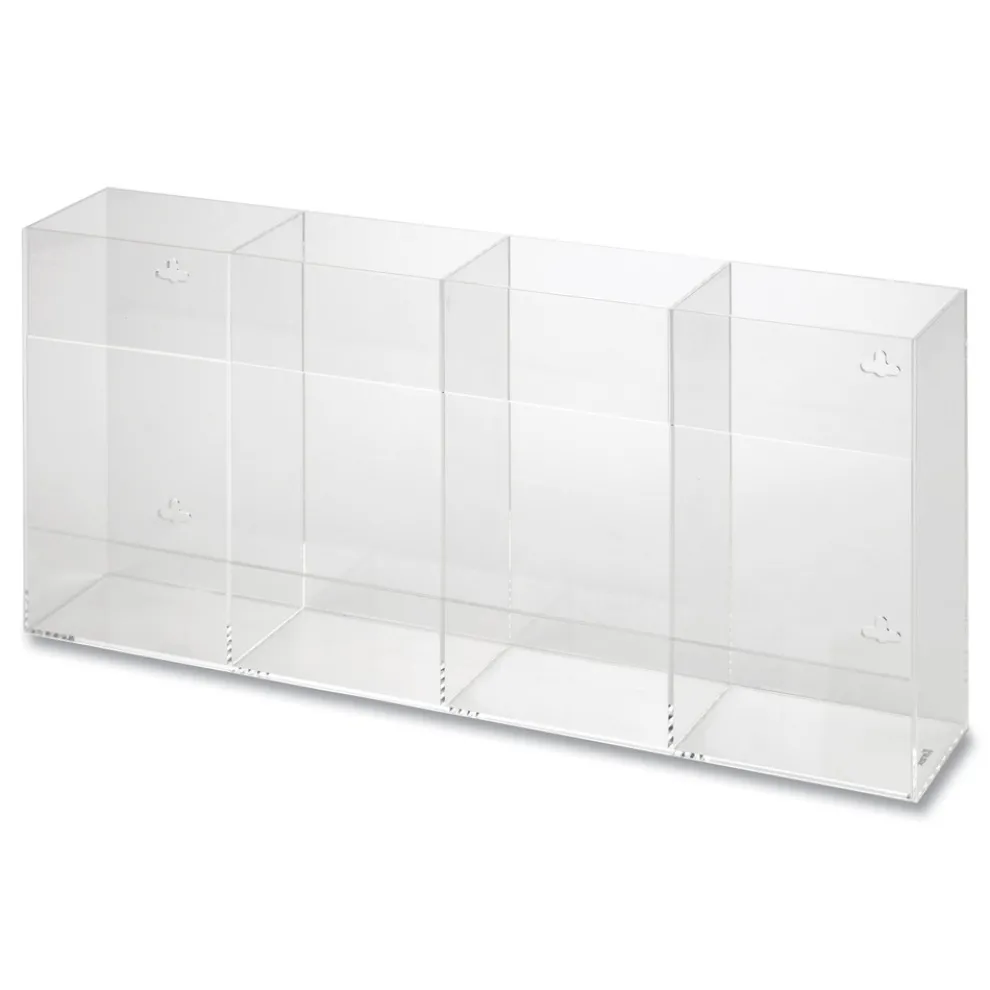 Quad glove dispenser made of heavy gauge clear acrylic. Dividers form individual compartments that allow for single box removal and replacement. Can be mounted vertically for left or right loading, and horizontally for top loading.