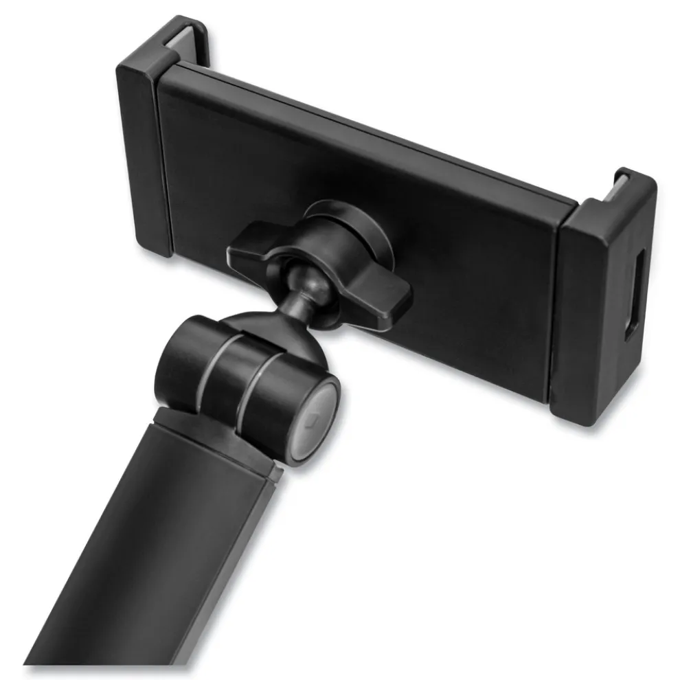 Adjustable mounting panel enables mulitple size tablets or phones to be held firmly.