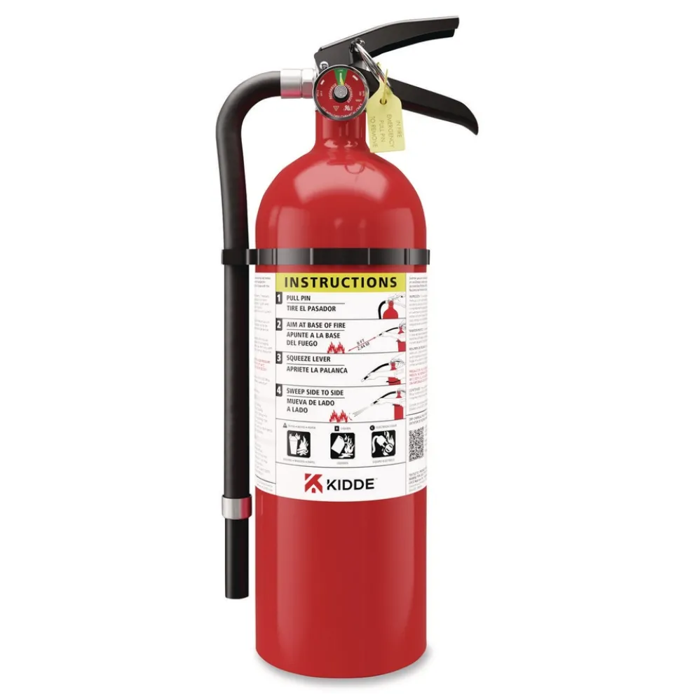 Safeguard your property with the dependable Kidde PRO-5MP rechargeable fire extinguisher, designed for commercial use to meet code compliance for larger areas and common fires involving wood, paper and textiles (Class A), flammable liquids and gases (Class B), and electrical equipment (Class C). Manufactured from durable, corrosion-resistant aluminum, the Kidde Pro fire extinguisher is a breeze to handle-it provides a remarkable discharge rate of 13 to 15 seconds, a range of 12 to 18 feet, and an operating pressure of 195 PSI. The sleek, painted aluminum handle, aluminum cylinder, and metal valve are impact-resistant-making the Kidde Pro fire extinguisher dependable when you need it most. The easy-to-pull safety pin gives you quick access for simple operation designed to combat fire hazards using the PASS (Pull, Aim, Squeeze, Sweep) firefighting method. The multi-directional discharge hose allows you to fight fire from various angles. Note that the dry chemical agent in this fire extinguisher is non-toxic but may cause skin irritation. Place a fire extinguisher within easy reach where fires are more likely to start. Rechargeable.