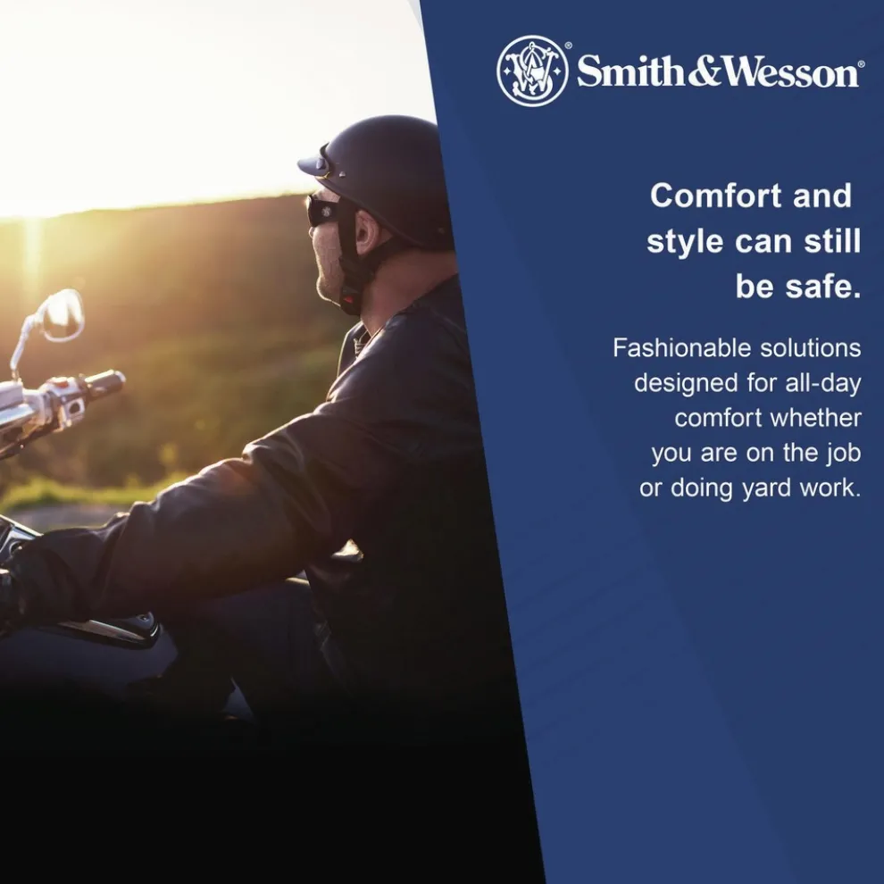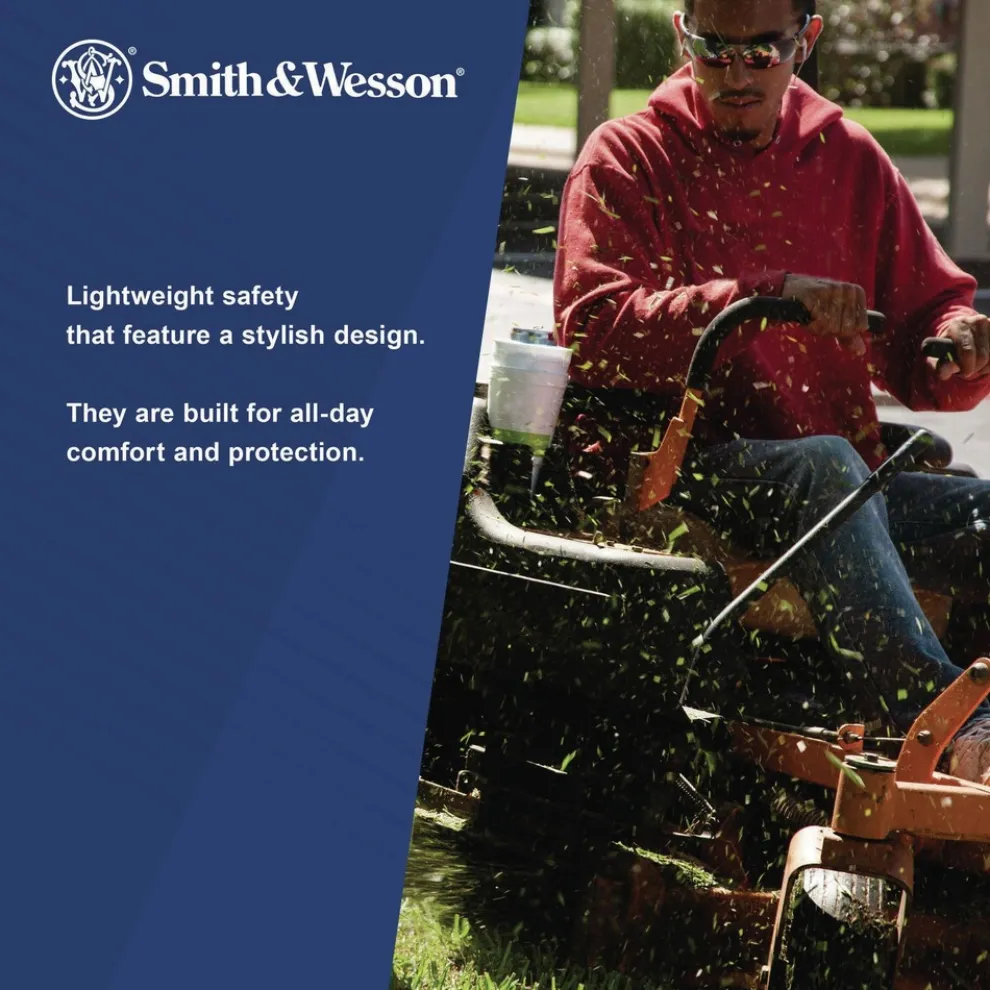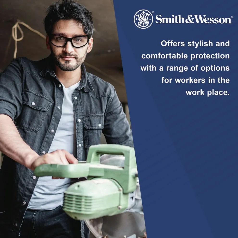 Smith & Wesson Code 4 Safety Glasses are a smart way to provide all-day comfort and protection, for both work and play. The stylish, minimal black frames hold smoke colored lenses (ideal for outdoor or bright environments) with a 7 base curve. The ribbed nose cushion helps keep the glasses from slipping and the contoured temple tips give the wearer a precise fit. The hinge stop helps prevent lens damage, so the protective glasses are really built to last. These glasses provide 99.9% UVA / UVB / UVC protection and meet ANSI Z87.1+ standards for high impact. No matter where you’re using them – at work or at home – Smith & Wesson Code 4 Safety Glasses deliver the comfort and protection you need.