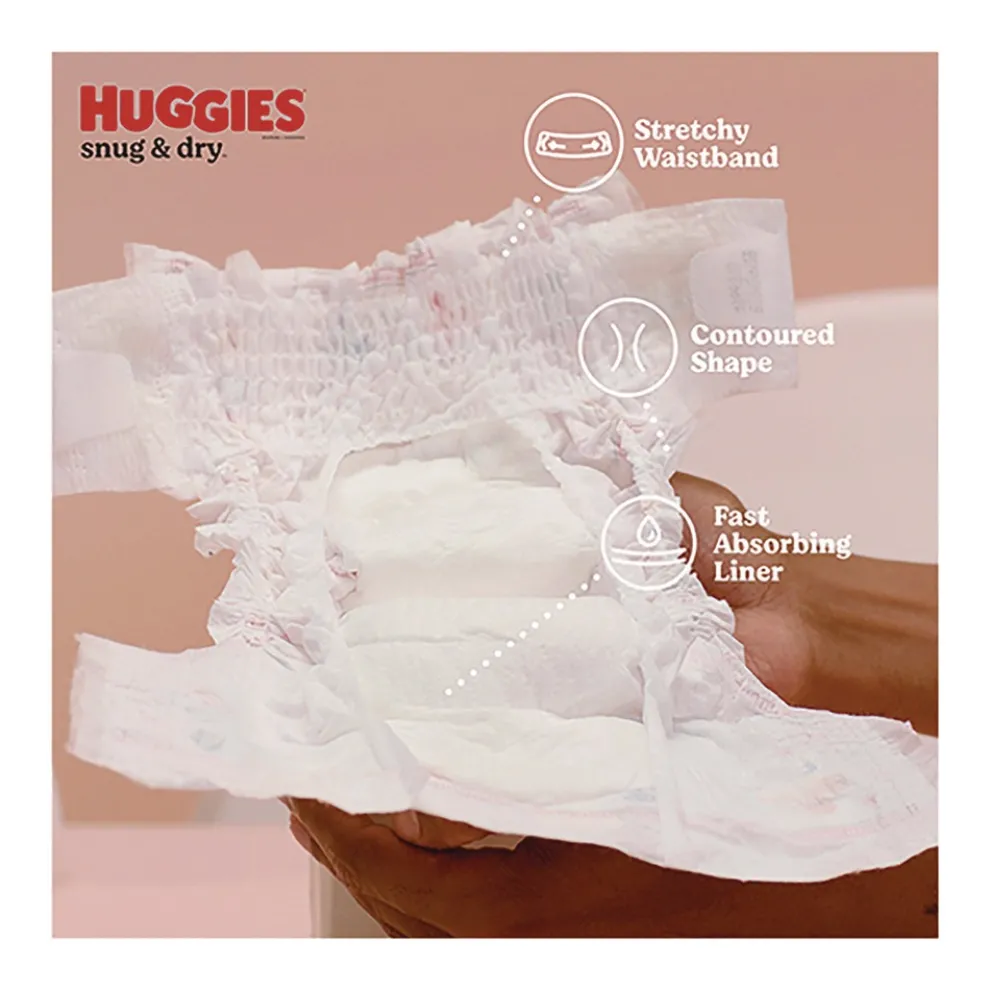 Huggies Triple Layer Protection absorbs wetness in seconds and up to 23 times its weight to help keep your baby dry and happy. Snug and Dry baby diapers have a narrow crotch width, a stretchy waistband and a contoured shape to help support healthy growth and development; a wetness indicator of a yellow line that changes to blue when wet lets you know when it’s time for a diaper change. Disposable diapers are hypoallergenic and free of fragrances, parabens, elemental chlorine and natural rubber latex for healthy, huggable skin. Huggies help prevent leaks for up to 12 hours, day or night, whether your baby is sleeping, crawling and walking.