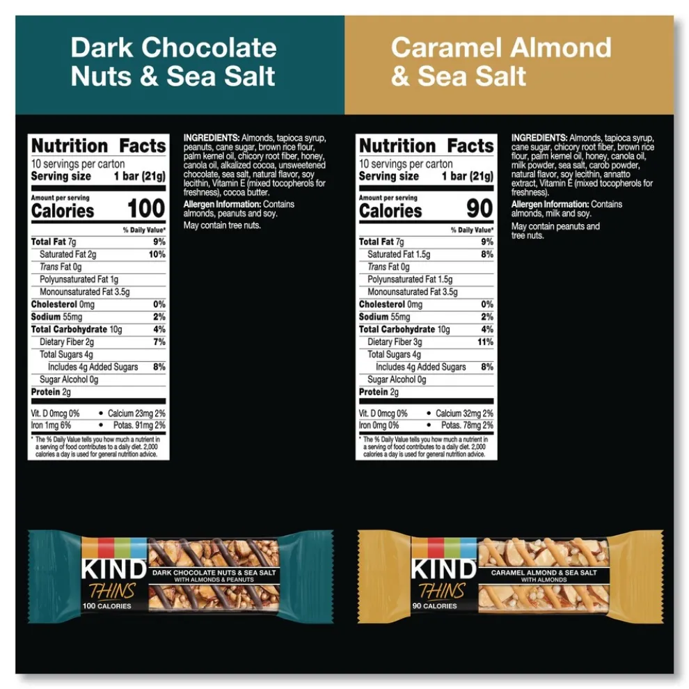 KIND 41888 0.74 oz Thins Bar Variety Pack – Caramel Almond and Sea Salt/Dark Chocolate Nuts and Sea Salt (20/Box)