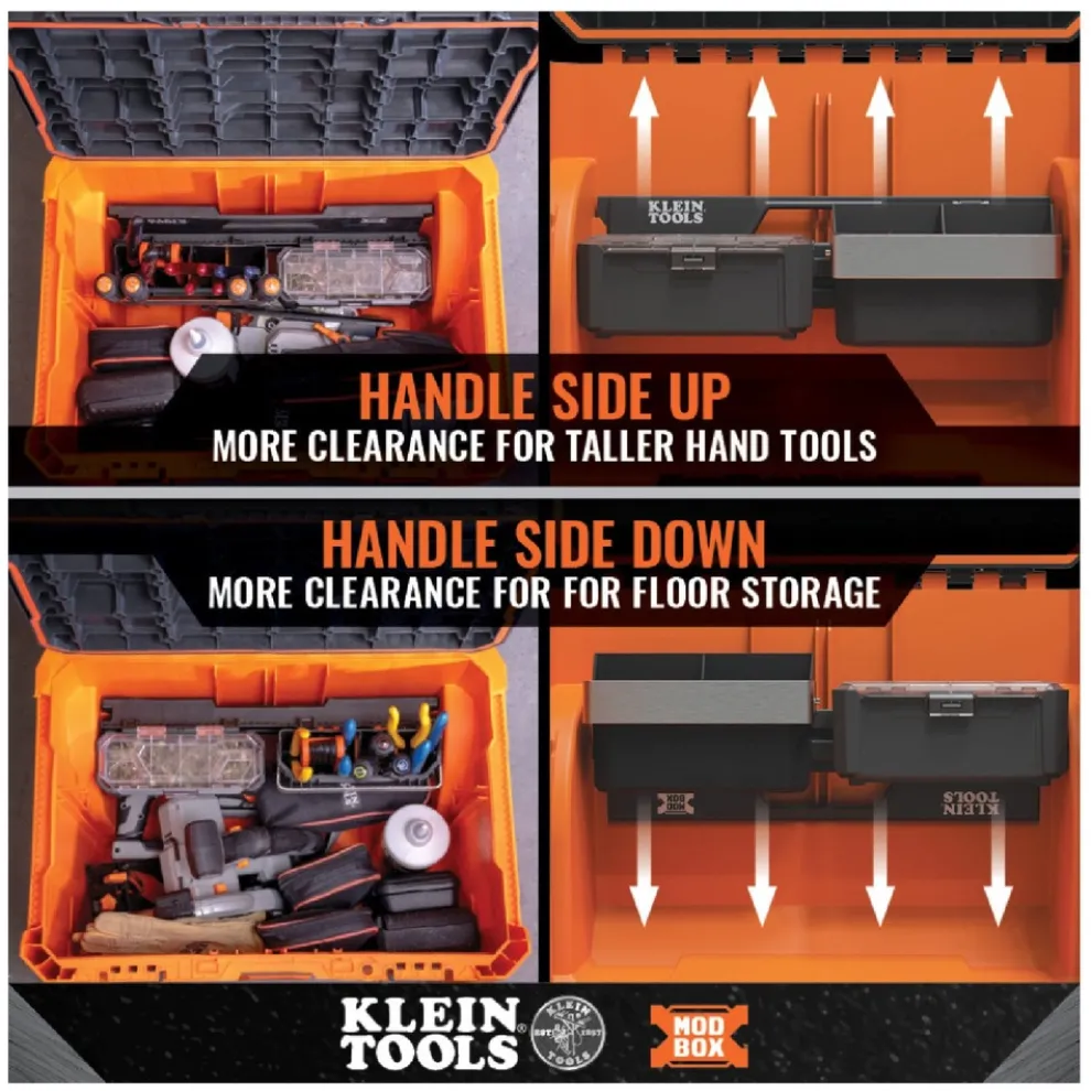 Klein Tools MODbox Internal Rail Accessory secures all rail attachments inside MODbox Rolling Toolbox (Cat. No. 54802MB) and Medium Toolbox (Cat. No. 54803MB). Use handle side up or down depending on the clearance needed. Use with all rail attachments including the Tool Carrier (Cat. No. 54814MB), Parts Bin (Cat. No. 54815MB), Multi-Hook (Cat. No. 54816MB), Cup Holder (Cat. No. 54817MB), and Magnetic Strip (Cat. No. 54819MB).