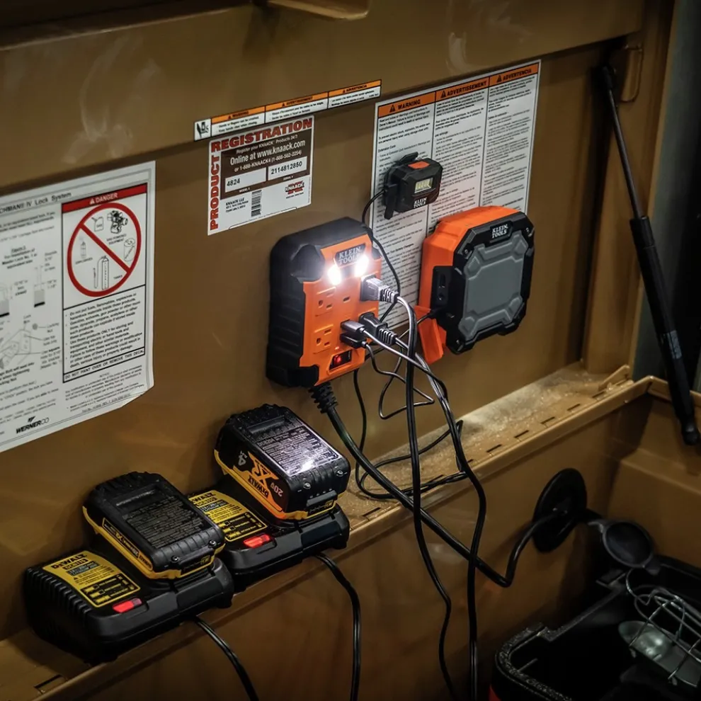 Klein Tools’ rugged PowerBox uses powerful magnets to easily mount anywhere in the metal job box or other magnetic surface, and includes built-in hanging holes for fixed mounting locations. Easily distribute power across your job box with 5 ft. durable power cord. Integrated LED lighting illuminates the inside of any dark job box to quickly find gear. Besides the four surge protected 120V outlets, the two USB-A and one 45W USB-C (PD capable) ports allow for convenient charging of personal devices including phones, tablets, and laptops.