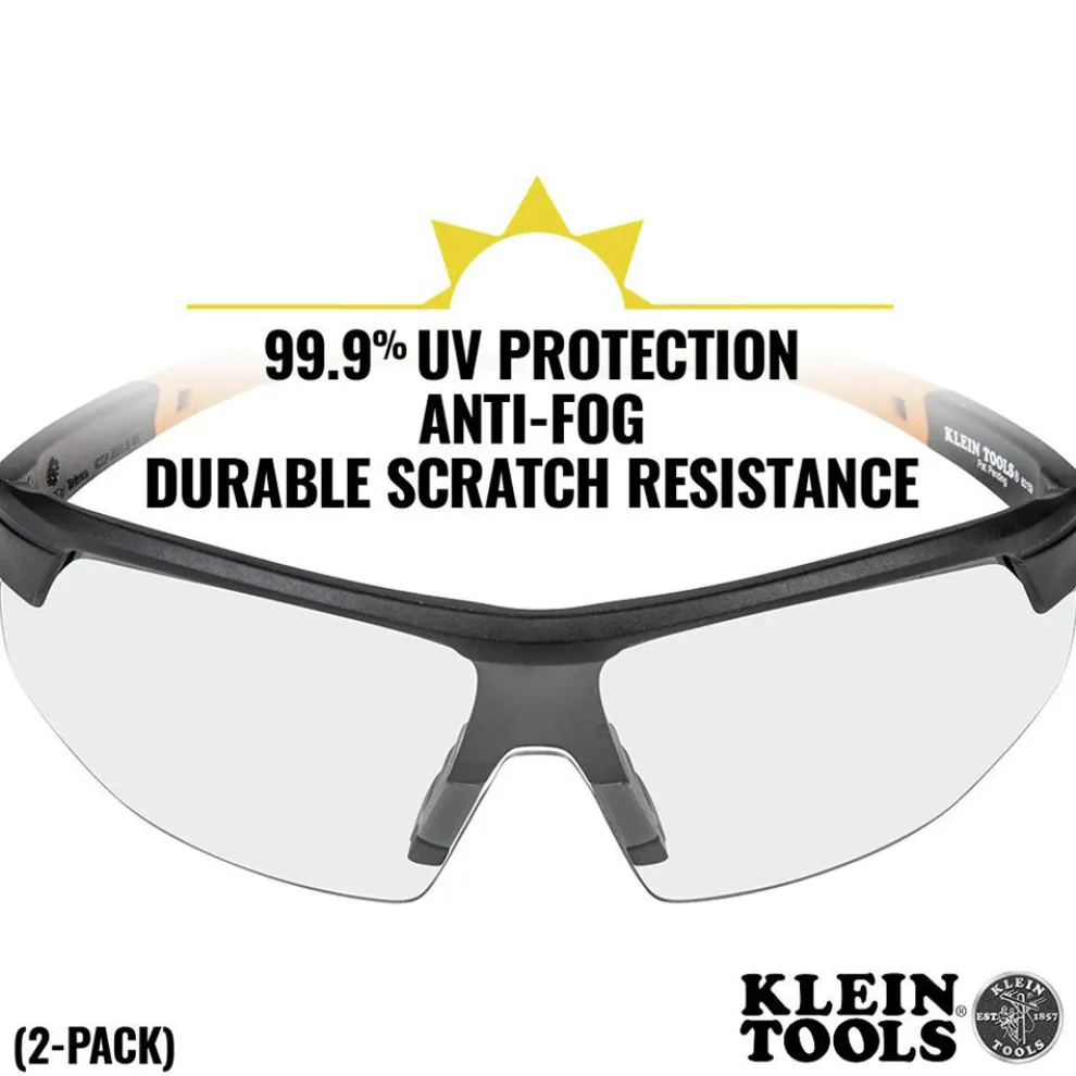 Klein Tools Safety Glasses are high-quality protective eyewear that feature an anti-fog coating that won’t wear off. Scratch resistant clear lenses with UV protection block 99.9% of harmful UV rays. Lightweight and flexible materials for long-term comfort with rubber nose piece and temples for face conforming fit and sure grip. This is a 2-pack. Optional Hard Case (Cat. No. 60176) and Breakaway Lanyard (Cat. No. 60177) sold separately.