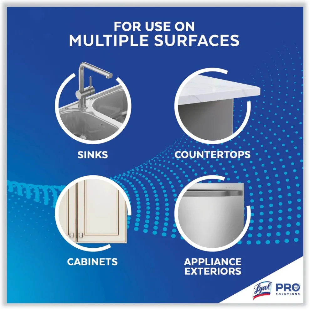 Equip your staff with a versatile kitchen cleaner that disinfects, cleans, and degreases in one solution. Cut through grease and grime in commercial kitchens for a deep down clean on counters, sinks, stovetops, and cabinets with Lysol Kitchen Pro Antibacterial Cleaner. Lysol kills 99.9 percent of viruses and bacteria (including Salmonella, E. Coli, and the virus that causes COVID-19) when used as directed on hard, non-porous surfaces.